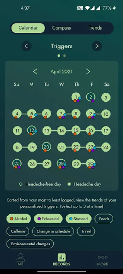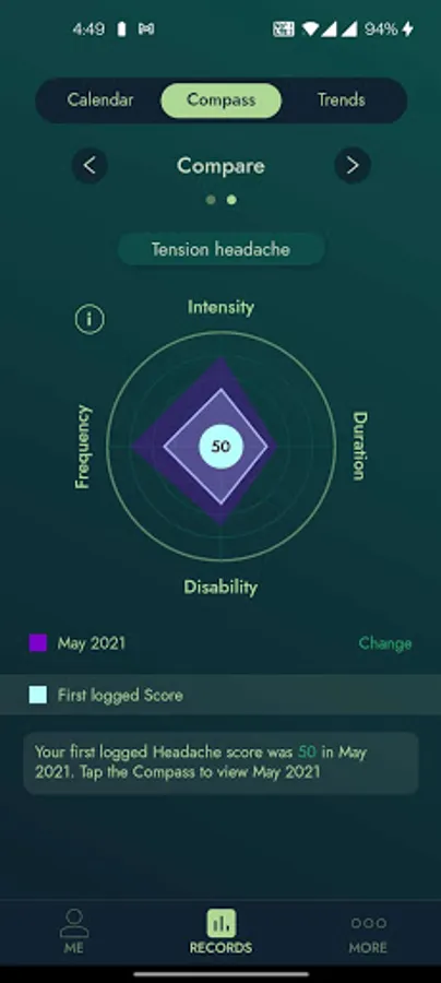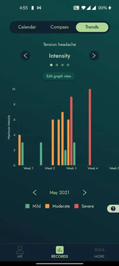 MigraineMentor is not a simple calendar or feel-good game. It is a serious tool for patients who want to get their migraine and other headaches under better control. The first time you open the BonTriage MigraineMentor app, you will be asked a short series of questions to help diagnose your headaches. It takes about 5 minutes. Once completed, you will see a Compass plot diagram of your headache with your initial headache score, which you can track over time as your headaches improve. Within just a few weeks you will see trend screens showing your progress.