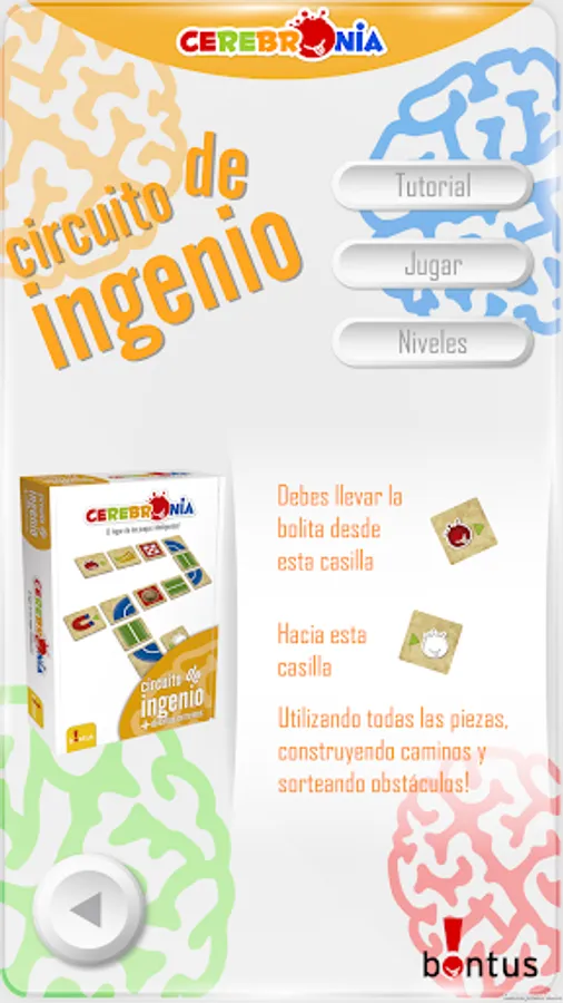 Ingenio Game 1. Circuit. Here you have to build roads using straight pieces, curves, ramps etc. to lead a ball from one place to another; on the road you have to overcome obstacles such as fences and wells, using ramps, magnets, springs and your wits! It contains 30 challenges of increasing difficulty, to agilices agudices your wits and your brain!