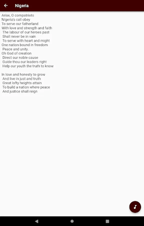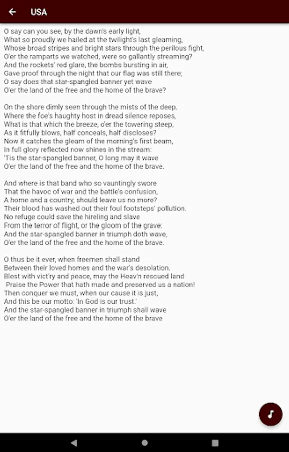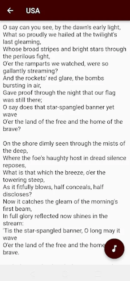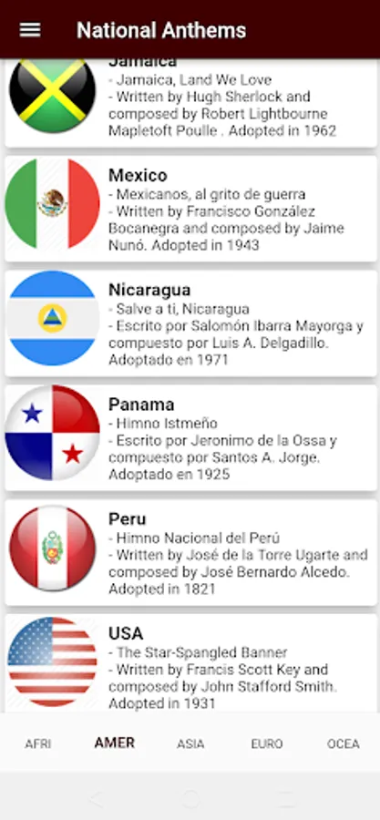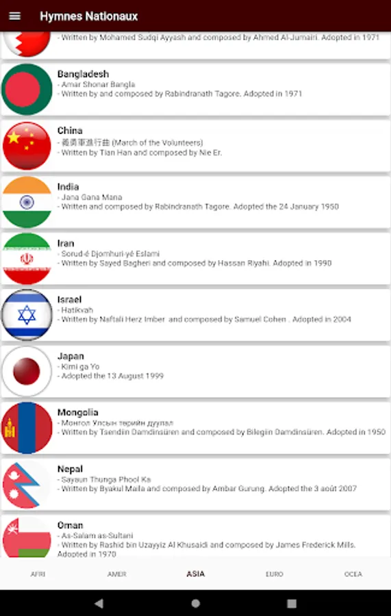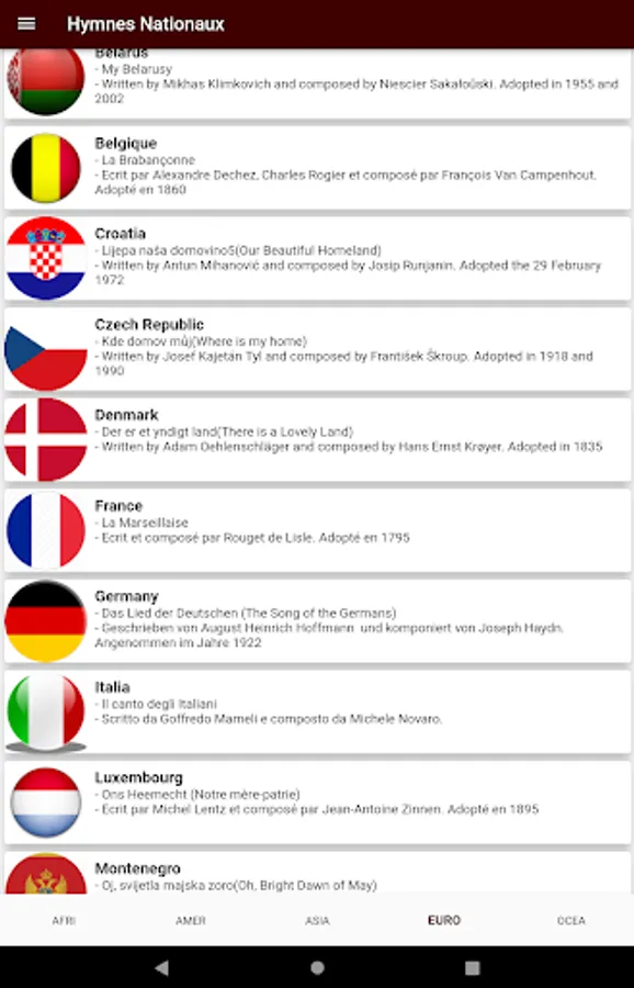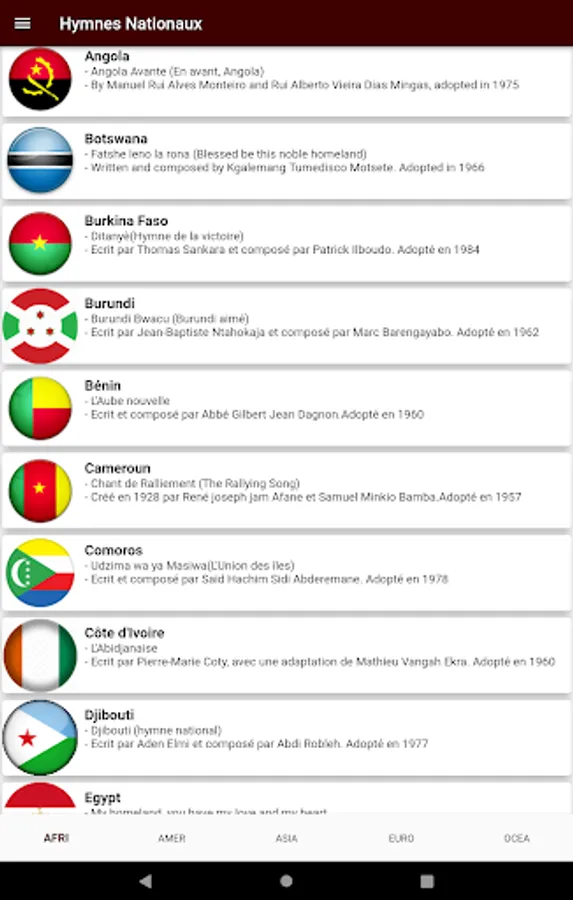 This application allows you to know the national anthems of the countries of the world in words and in music. It also lets you know the authors and the year of adoption of these national anthems.