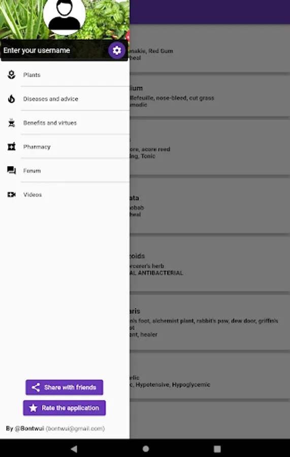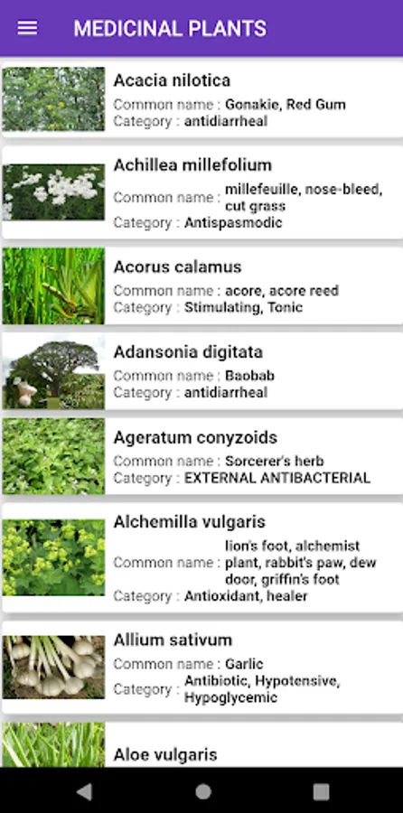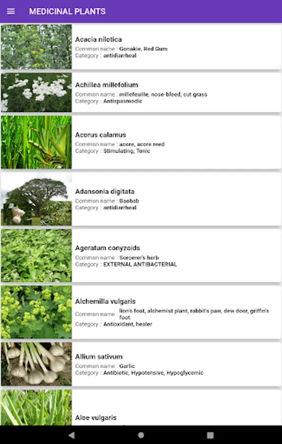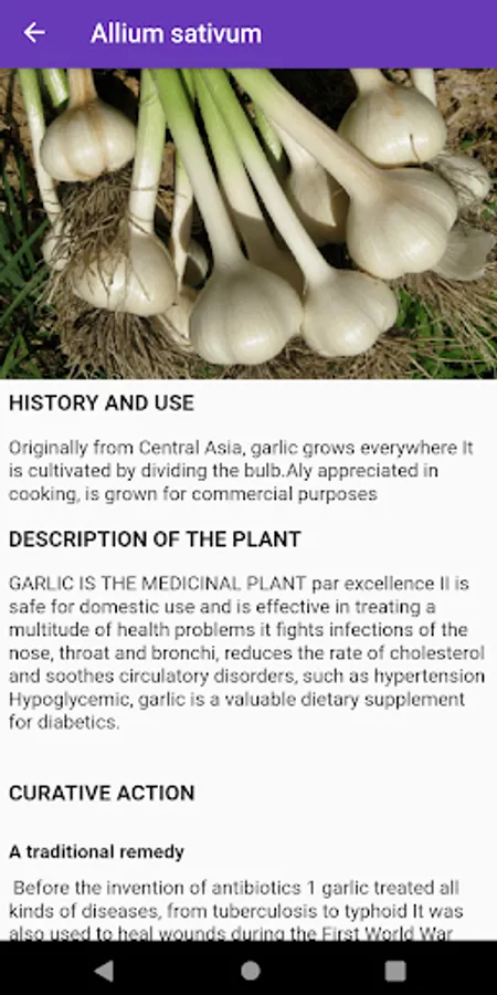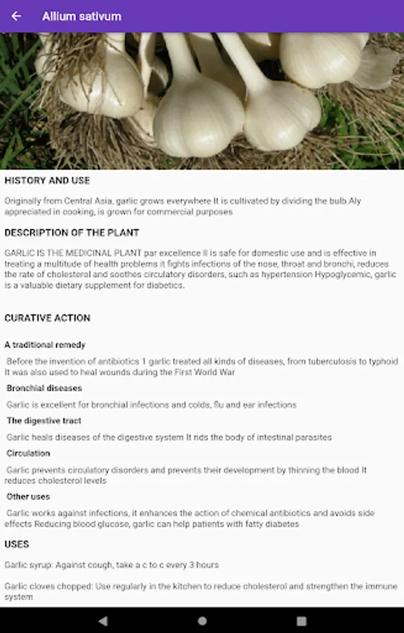 The plants menu allows you to know the majority of plants, natural herbs and the roots with medicinal virtues on health. This menu details the virtues, scientific names, chemical compounds and how to use plants to have a natural remedy. The most used plants and herbs are: mint, lemongrass, licorice, ginseng, nettle, basil, garlic, onion, king of herbs, aloe vera, papaya, cassia alata, lemon tree , guava tree, turmeric, ginger, eucalyptus, ginkgo biloba, parsley.