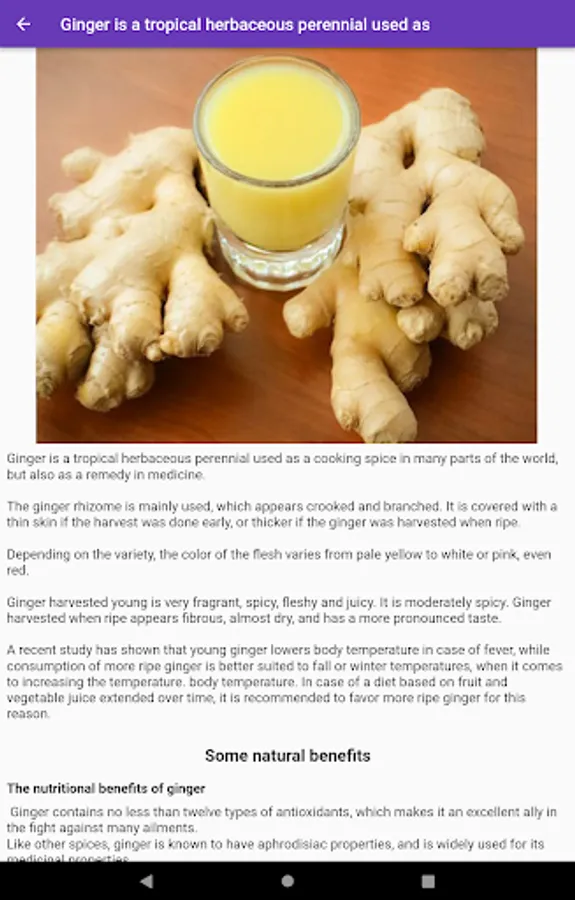 The Video menu explains in more detail the plants, herbs, barks and spices having medicinal properties. It offers videos on the benefits and virtues of turmeric, ginger, cloves, garlic, onion, mint, dandelion, honey, moringa, neem oil, ginseng, lemongrass, eggplant, beetroot, maca, aloe vera.