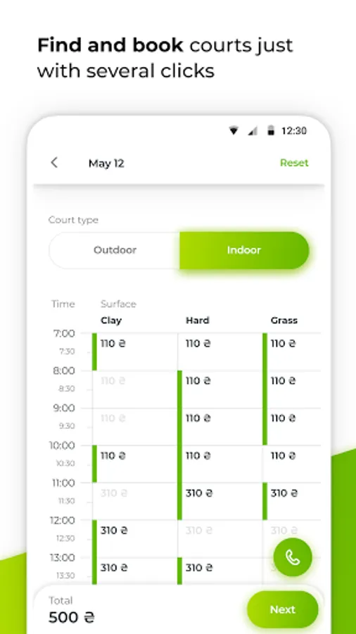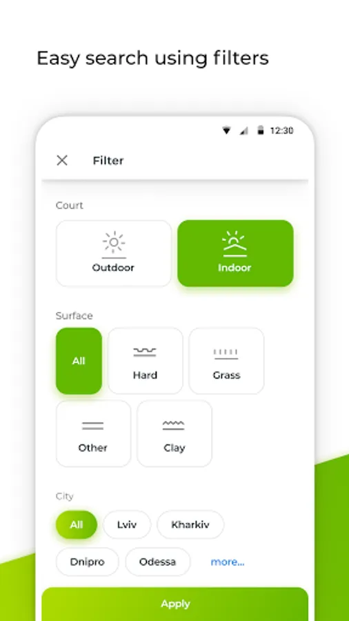 - you can set the city and type of the courts, search for a free courts by the time and the date or using the map to determine the closest to your location;