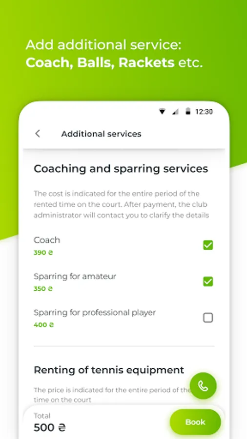- reservation through Book4Sport on an additional services: coach and sparring, rental of balls and rackets and other services.