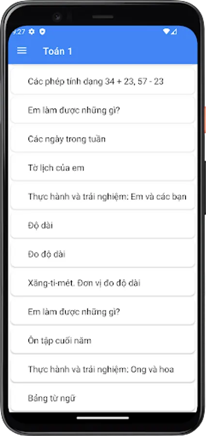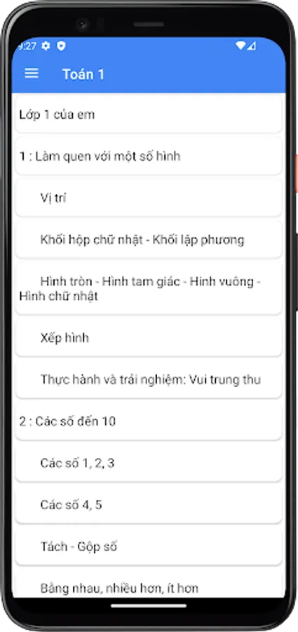 My 1st grade 1 : Get acquainted with some shapes Position Rectangle - Cube Circle - Triangle - Square - Rectangle Puzzle Practice and experience: Mid-Autumn Festival 2: Numbers to 10 Numbers 1, 2, 3 Numbers 4, 5 Split - Add numbers Equal, more, less Compare numbers: equal, greater than, less than Signs =, >, < Number 6 Number 7 Number 8 Number 9 Number 0 Number 10 What can you do? Practice and experience: Western River 3: Addition, subtraction within 10 Addition within 10 Addition within 10 Add by counting more Subtraction Subtraction within 10 Minus by counting down You can do it things? Review term 1 Practice and experience: I walk according to traffic rules 4: Numbers up to 20 Numbers up to 20 Calculations form 10 + 4, 14 - 4 Calculations form 12 + 3, 15 - 3 My watch What can I do? 5 : Numbers up to 100 Tens - Round numbers 30 + 20, 50 - 20 Tens - Units Numbers up to 40 Compare numbers Numbers up to 100 Table of numbers 1 to 100 Type 34 operations + 23, 57 - 23 What can you do? Days of the week My calendar Practice and experience: Me and friends Length Measure length Centimeters. Units of length What can you do? Year-end review Practice and experience: Bees and flowers Vocabulary