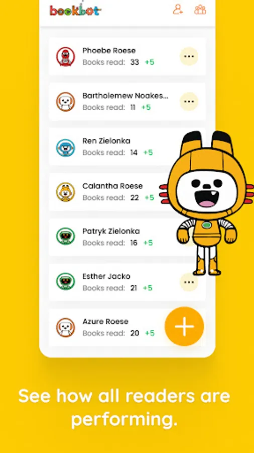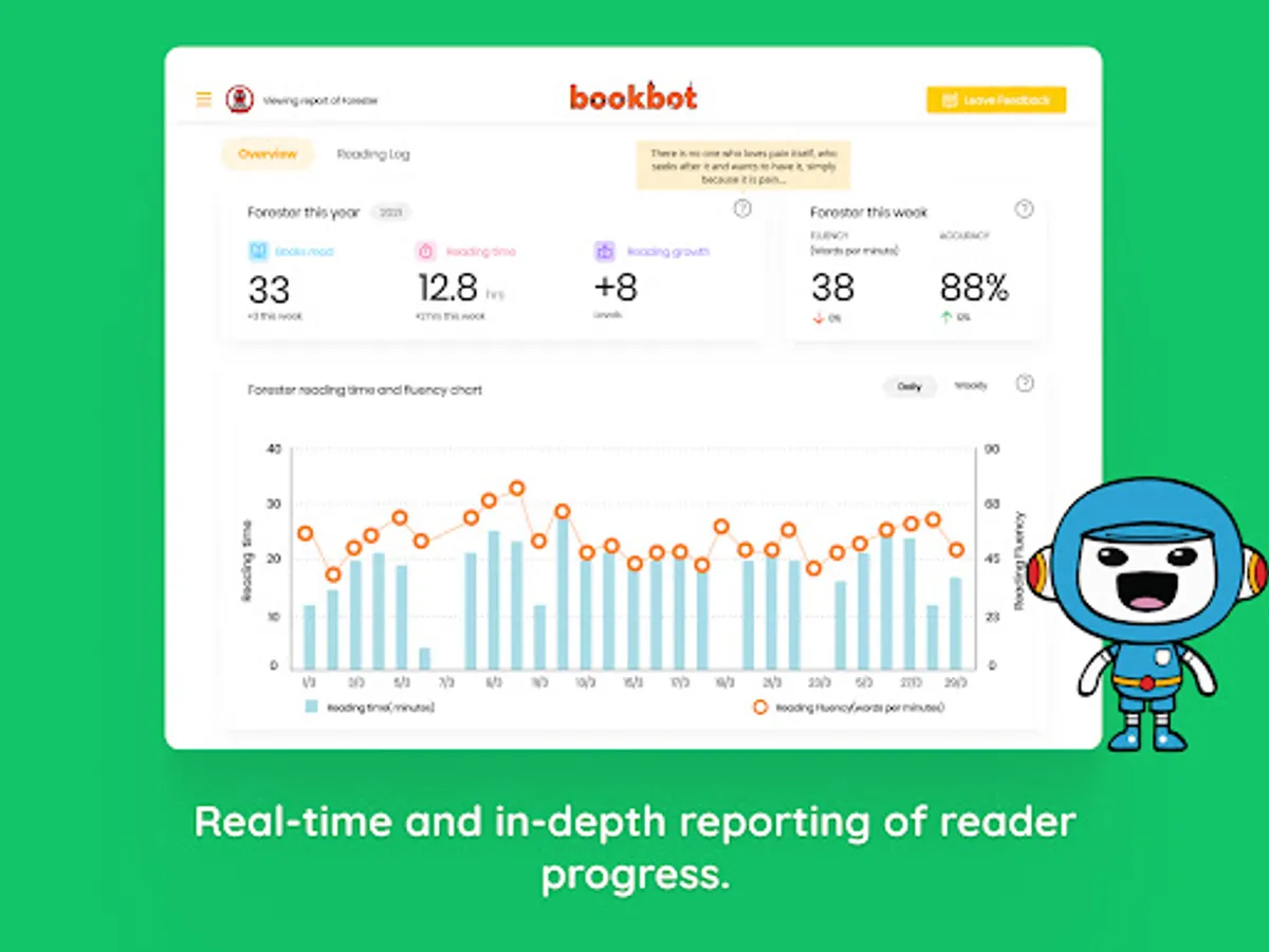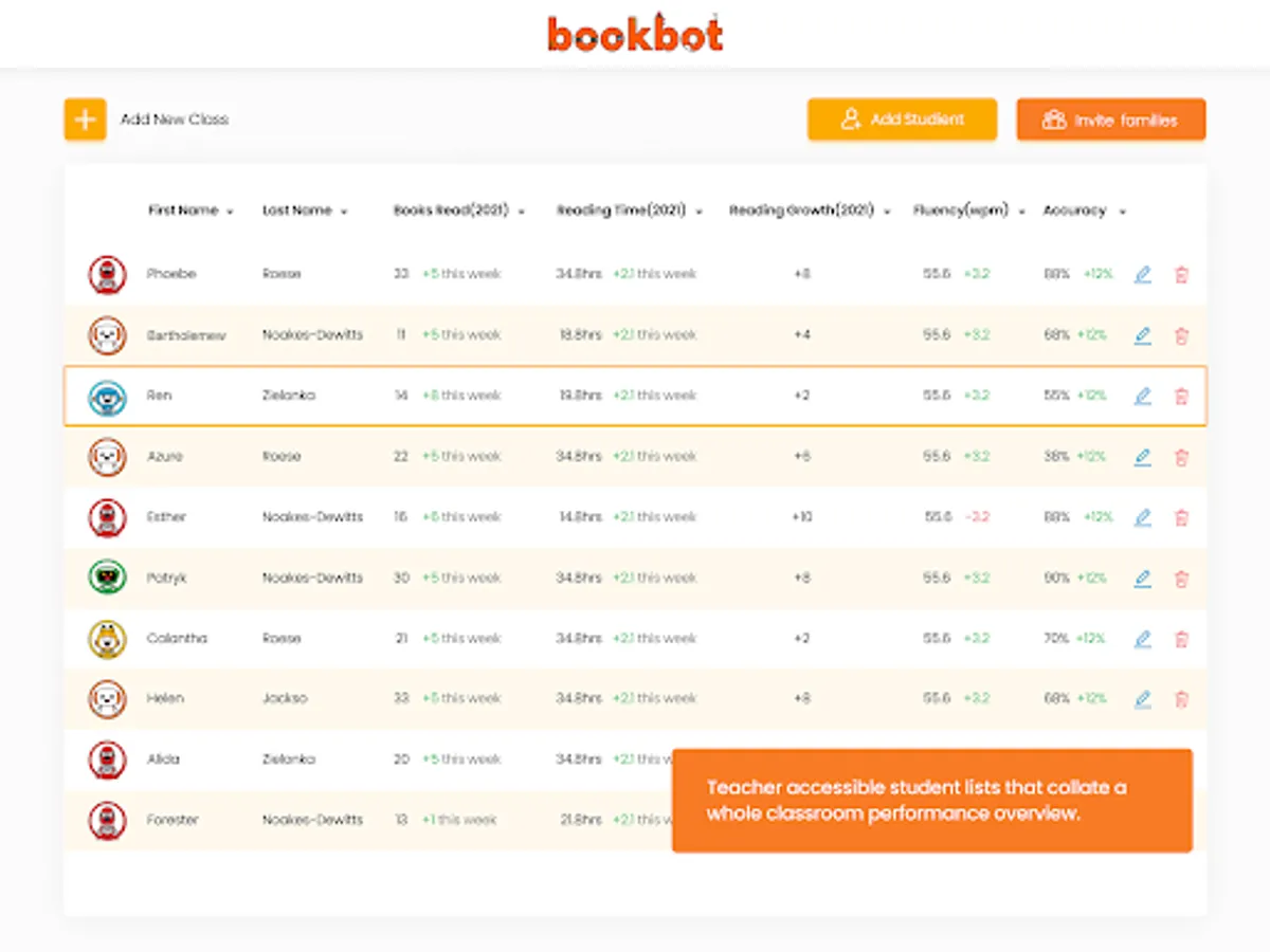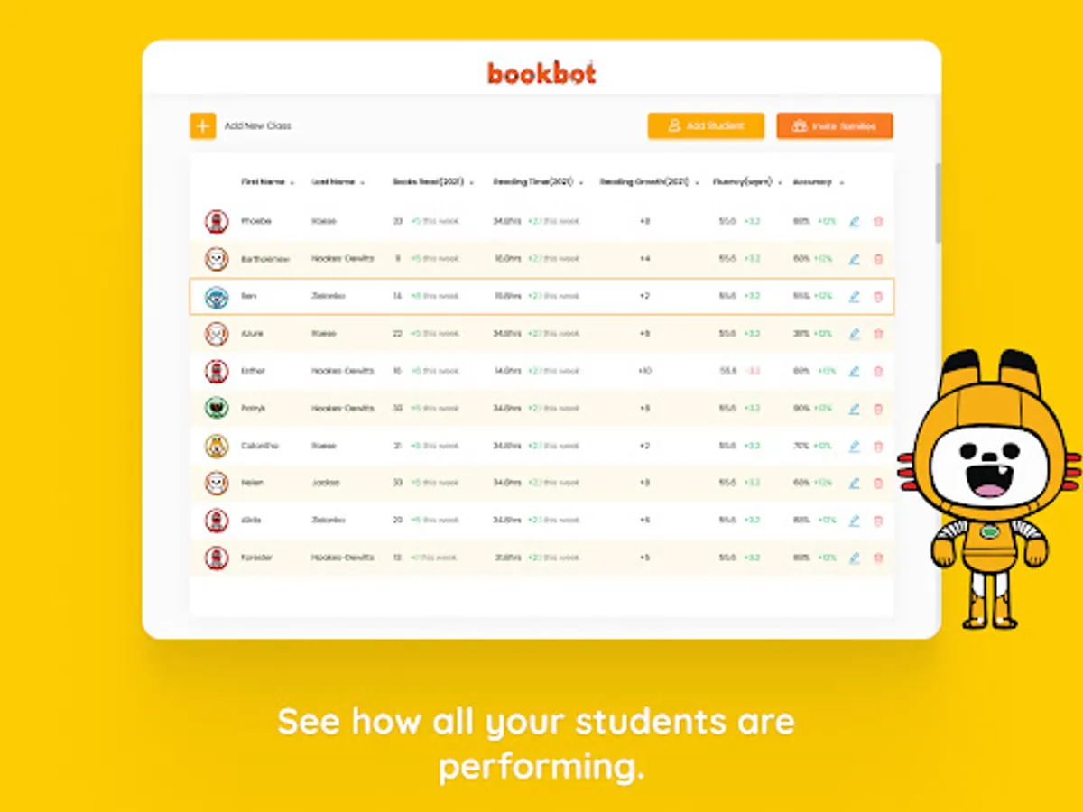 The Bookbot Educators and Families App is a progress tracking tool that allows you to see your student's reading progress. You can see how well they're doing, what books they're enjoying most, where they need more help, and share this information with educators or family members on the app too. The app is complete with a reading log, student lists and progress charts that highlight fluency and accuracy rates, so that you can determine how to best support your students in their reading journey.