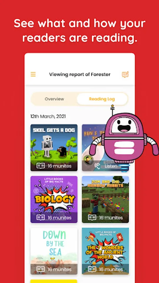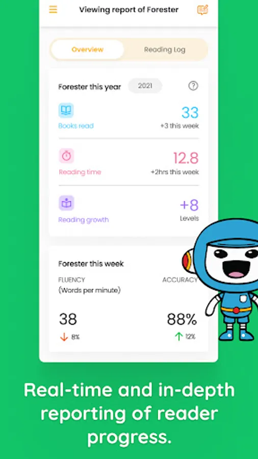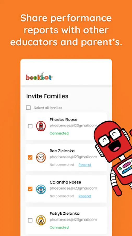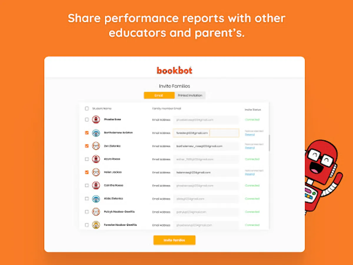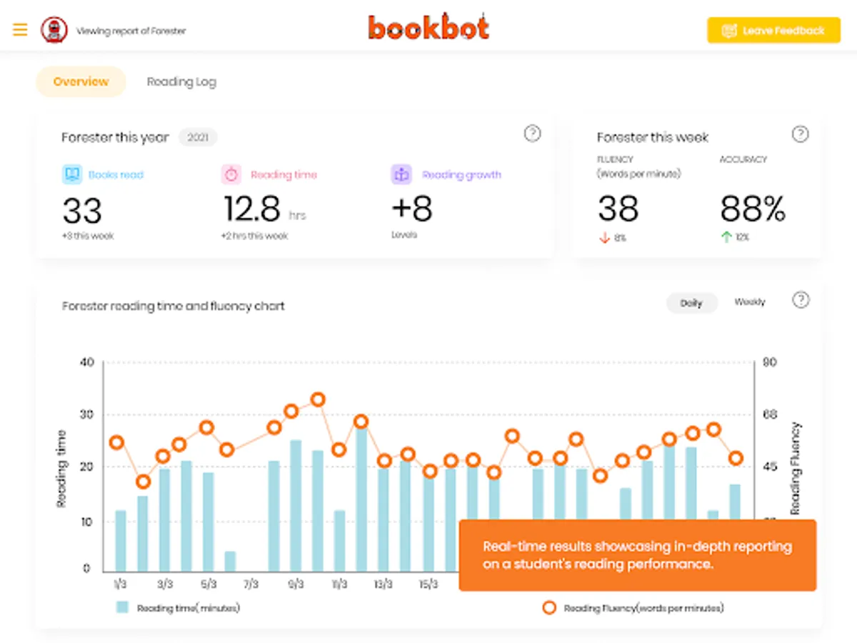 The Bookbot Educators and Families App is a progress tracking tool that allows you to see your student's reading progress. You can see how well they're doing, what books they're enjoying most, where they need more help, and share this information with educators or family members on the app too. The app is complete with a reading log, student lists and progress charts that highlight fluency and accuracy rates, so that you can determine how to best support your students in their reading journey.
