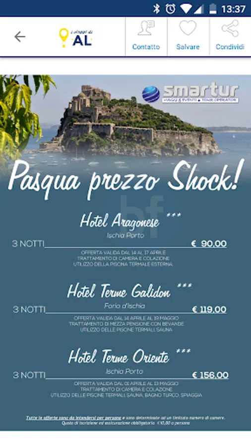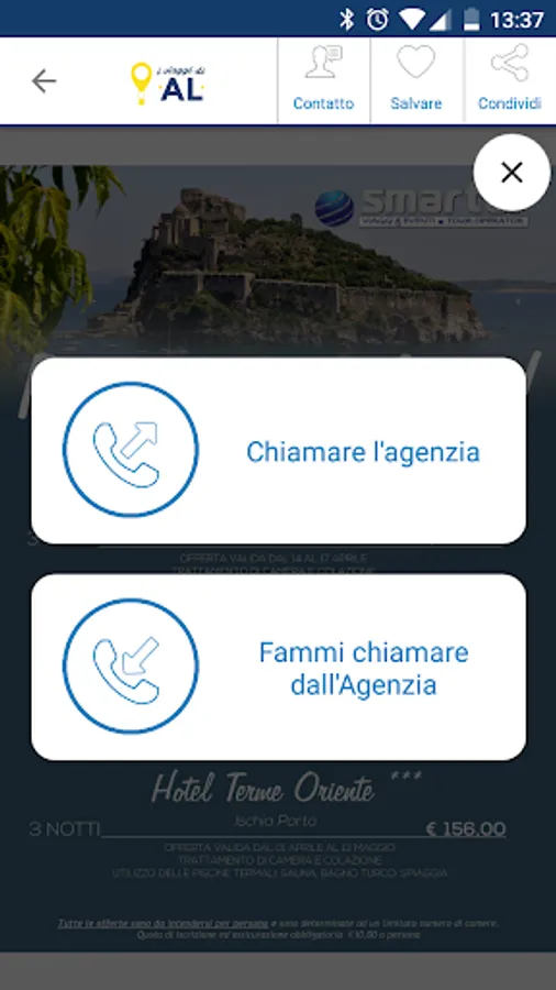 A wide selection of last minute travel offers, bridges, cruises, tours, and more. With a single gesture you can save the offer as a favorite, share it with WhatsApp, in email, on Social Network, call the Agency or request to be contacted directly by the travel