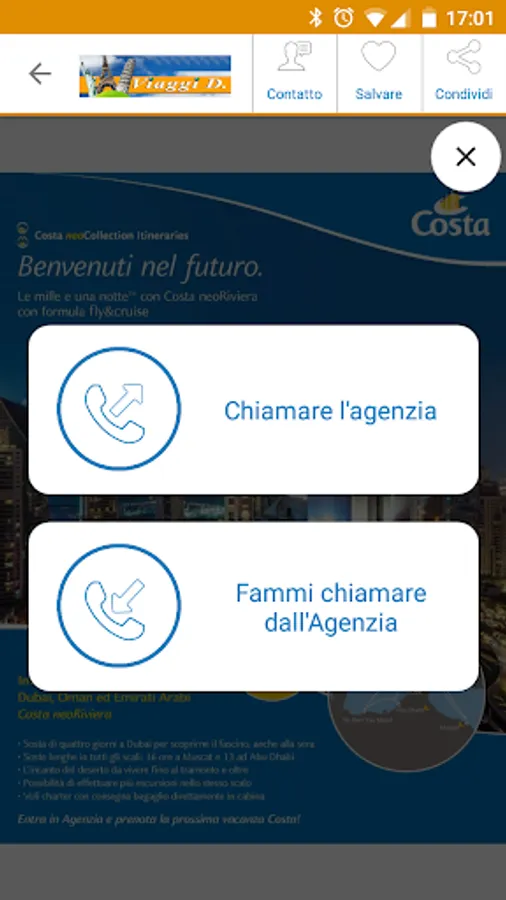 A wide selection of last minute travel offers, bridges, cruises, tours, and more. With a single gesture you can save the offer as a favorite, share it with WhatsApp, in email, on Social Network, call the Agency or request to be contacted directly by the travel agent.