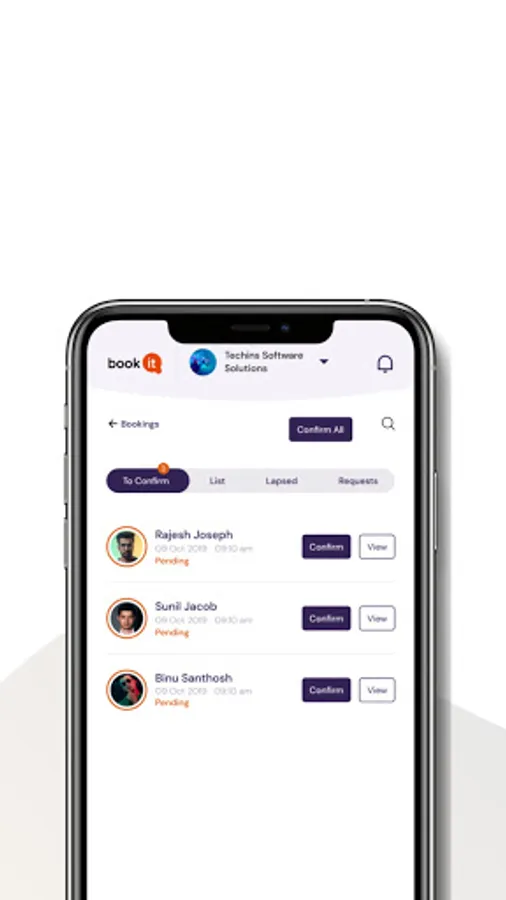 Each Servicing employee gets individual user access and can his account through Bookit Vendor App to confirm, reschedule, cancel or complete the service bookings booked against the employee.