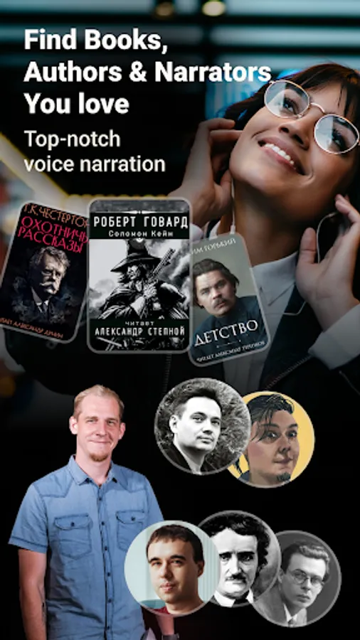 📚 An excellent library of audiobooks for every taste from famous authors such as Leo Tolstoy, Joe Abercrombie, Howard Phillips Lovecraft, Jack Ritchie, Roman Surzhikov, Vitaly Zykov, Andrey Loskutov and many other Russian and English classics. You will also meet many new rising authors and narrators on BOOKlis.