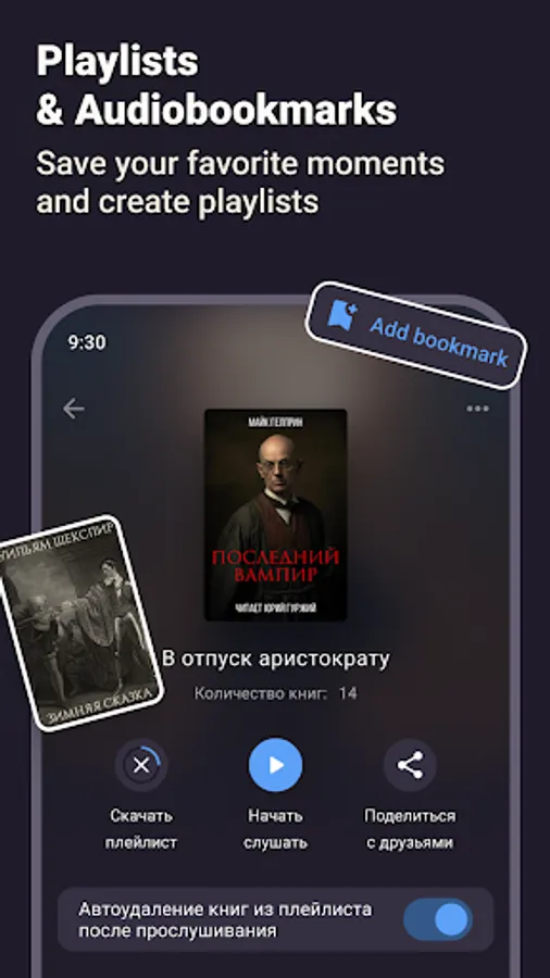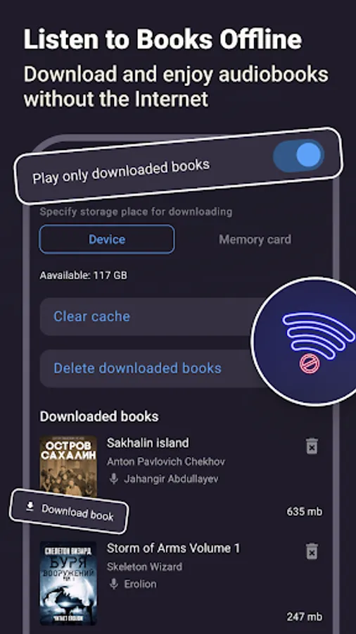 • Want to listen to audiobooks without the Internet? Download books to your smartphone to enjoy them offline, for example, when roaming or in flight mode;