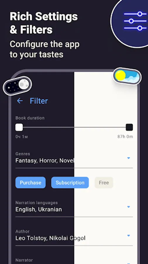 🎧 High-quality voice acting in Russian and Ukrainian from eminent and professional narrators, whose voices have already managed to fall in love with many: Kirill Golovin, Shad Ibraev, Ivan Savoskin, Oleg Buldakov, Vladimir Knyazev, Alisa Pozdnyak, Casper Valter and others.