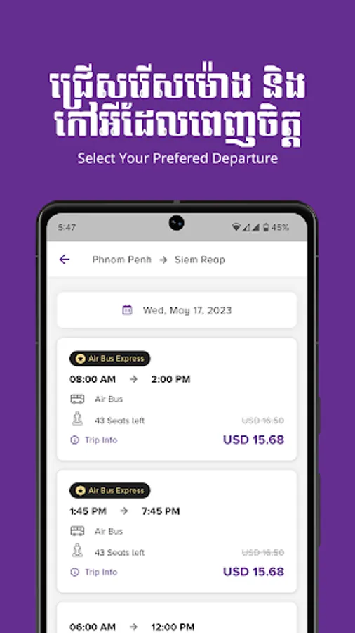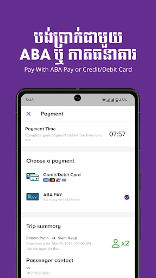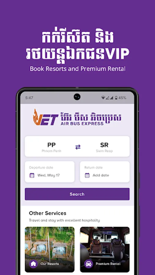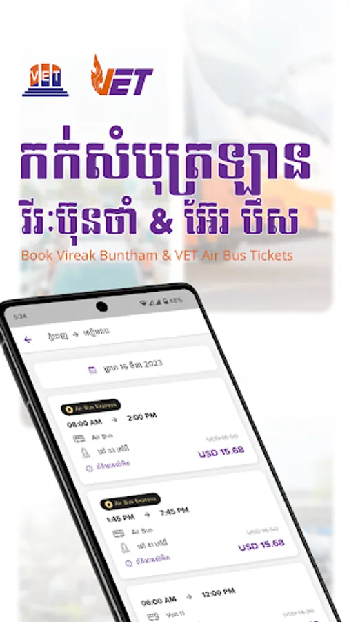 Book and pay securely for your tickets on VET Air Bus by Vireak Buntham app with ABA PAY, VISA, Mastercard, and more. Travel hassle-free and board to your destination with just the e-tickets from our app.