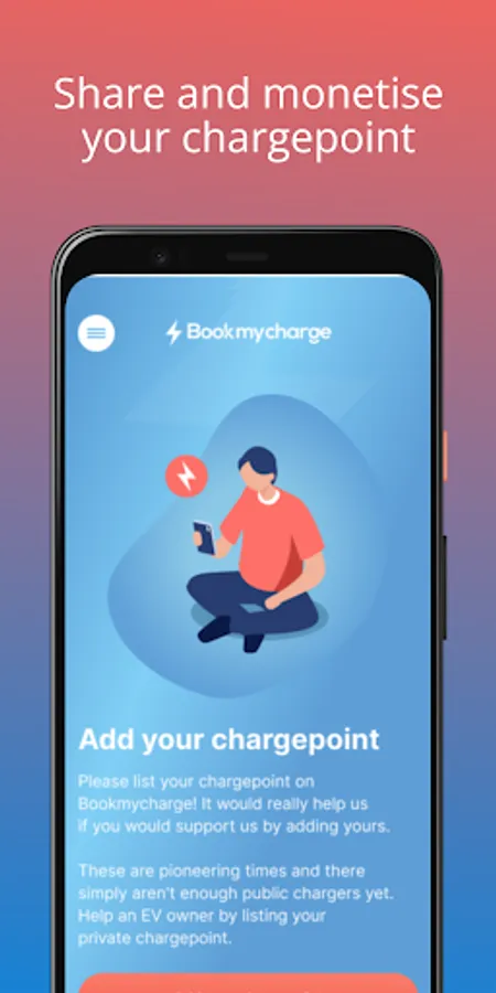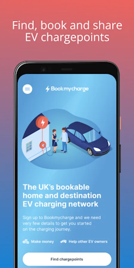 The Bookmycharge app allows members of the EV (Electric Vehicle) community to search for and book chargepoints around the country and list their own chargepoints to earn money through other people booking them.