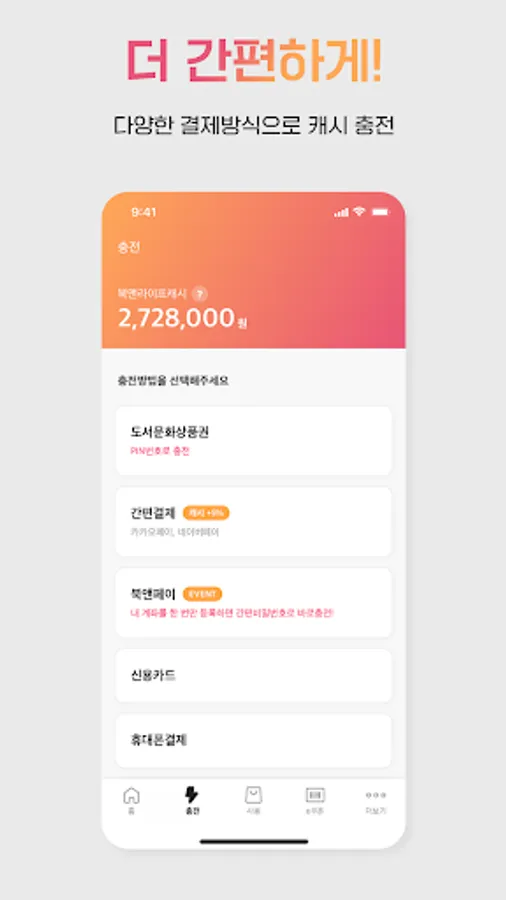 Simple payment (Naver Pay, Kakao Pay, Samsung Pay), mobile phone payment, credit card, account transfer, mobile coupon (Gifticon, Kakao Talk, Gifti Show, I-Number), point recharge (T-money, Smart Touch, credit card points) , Point Exchange (OK Cashback)