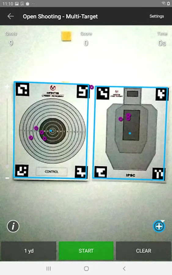 Smart targets are automatically detected and scored by Mantis Laser Academy. Using smart targets provides the most enjoyable and valuable training experience. The Control Target allows you to Start, Stop, Clear, and Close in the app by shooting specific regions on the Control Target.