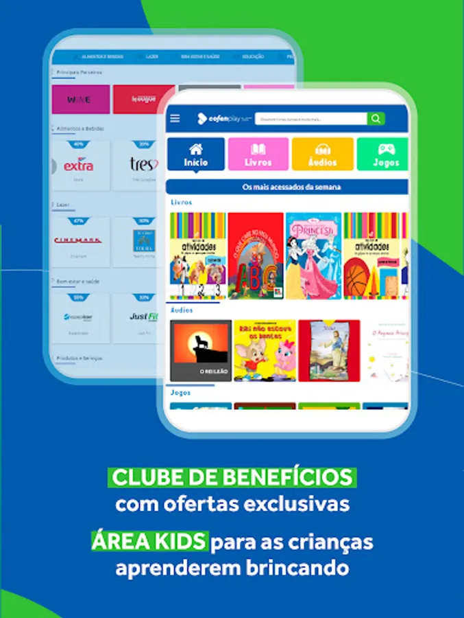 In addition to all this content, Cofenplay offers a Benefits Club with special offers and discounts on food, leisure, wellness, health, products and services. And Kids area with books, audios, printable activities and educational games for children to learn while playing.