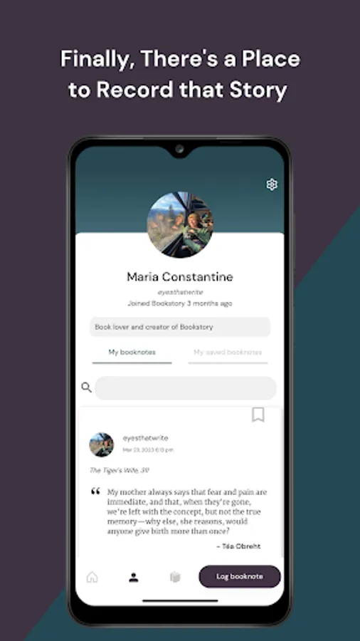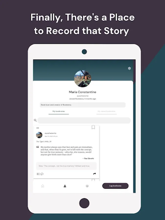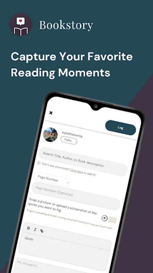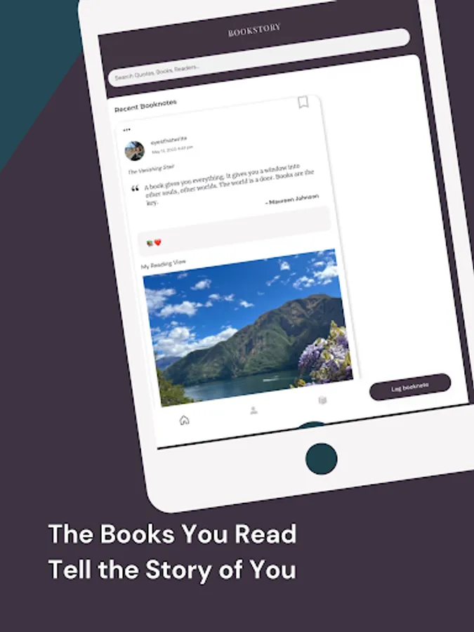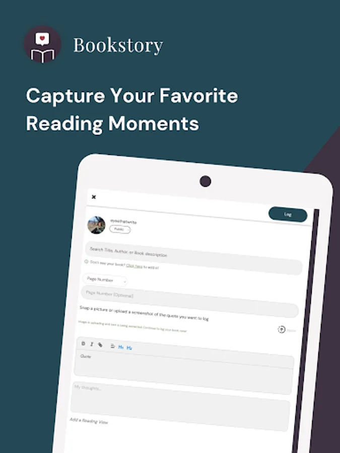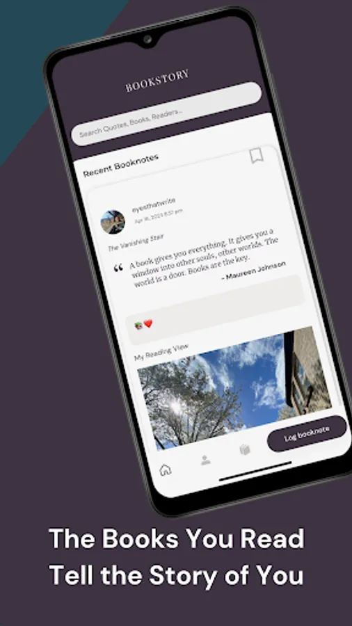 Bookstory allows you to capture the Reading Moments that inspire, surprise and delight you! Log a Booknote to capture a quote and jot down your thoughts—why did you love it? What made this moment special? You can also tag each logged Booknote with your Reading View: an unfiltered picture of where you were during that Reading Moment.