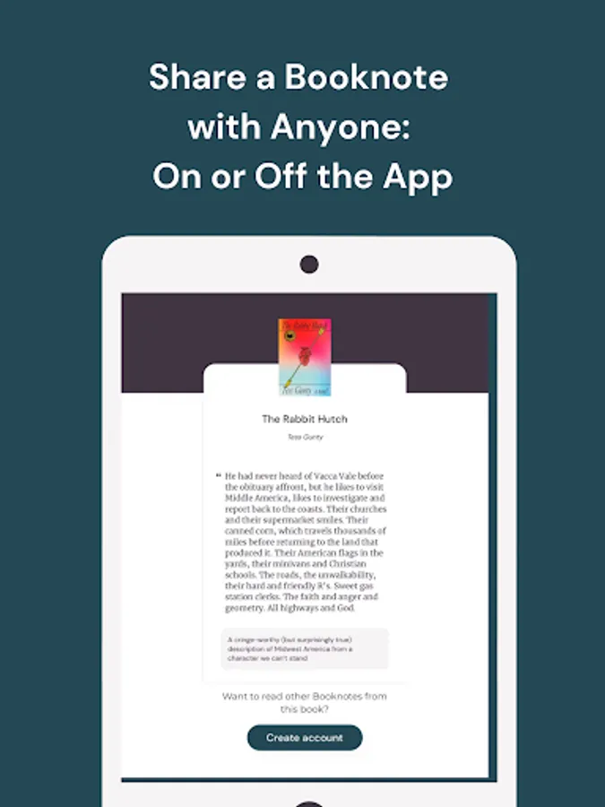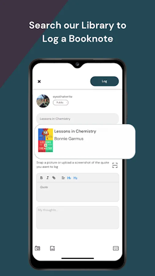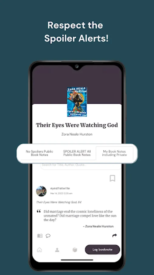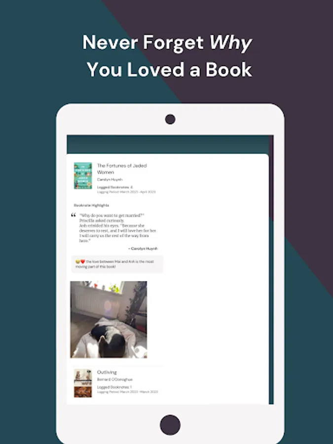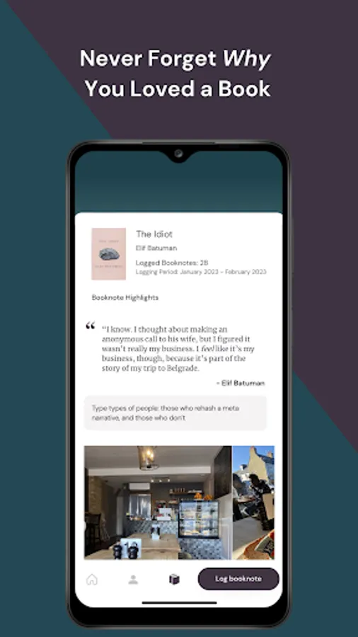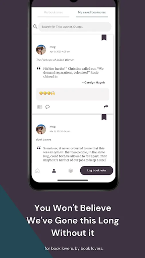 Bookstory allows you to capture the Reading Moments that inspire, surprise and delight you! Log a Booknote to capture a quote and jot down your thoughts—why did you love it? What made this moment special? You can also tag each logged Booknote with your Reading View: an unfiltered picture of where you were during that Reading Moment.
