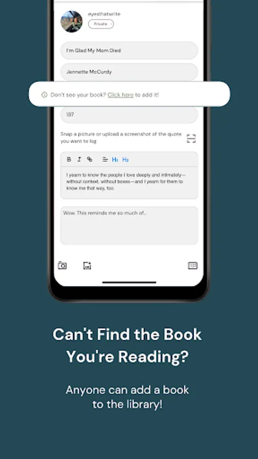 Are you guilty of screenshotting quotes? Have you ever written down a memorable phrase from a story only to lose the scrap paper or Note on your phone where you tracked it? Have you ever been in conversation about a meaningful book, wanting to reference a SWOON moment or an inspiring quote, only to paraphrase it and completely lose the power of the quote in translation? Bookstory is the answer! Log those special Reading Moments for easy reference later, deeper engagement with books, and nostalgic reminiscing.