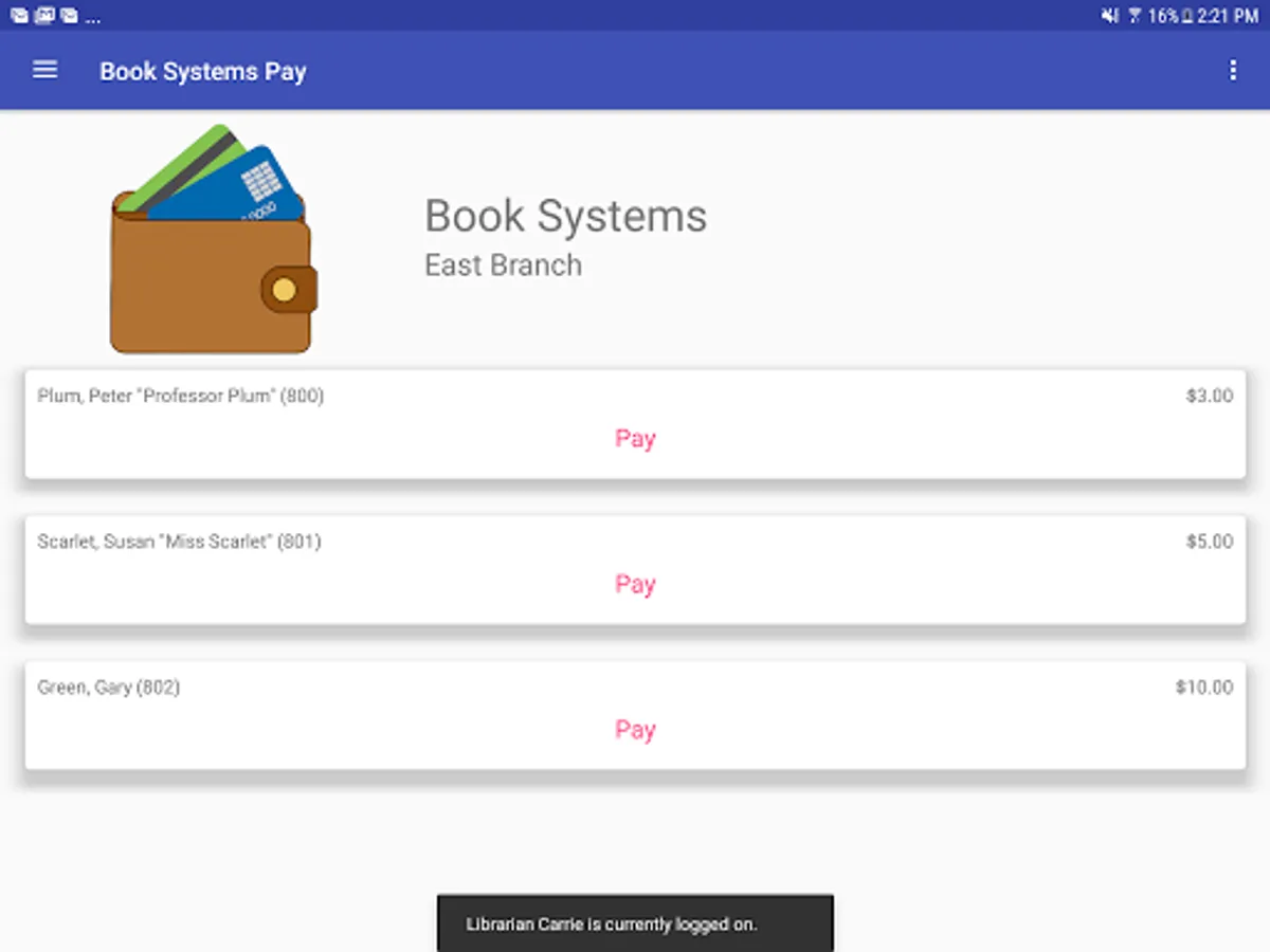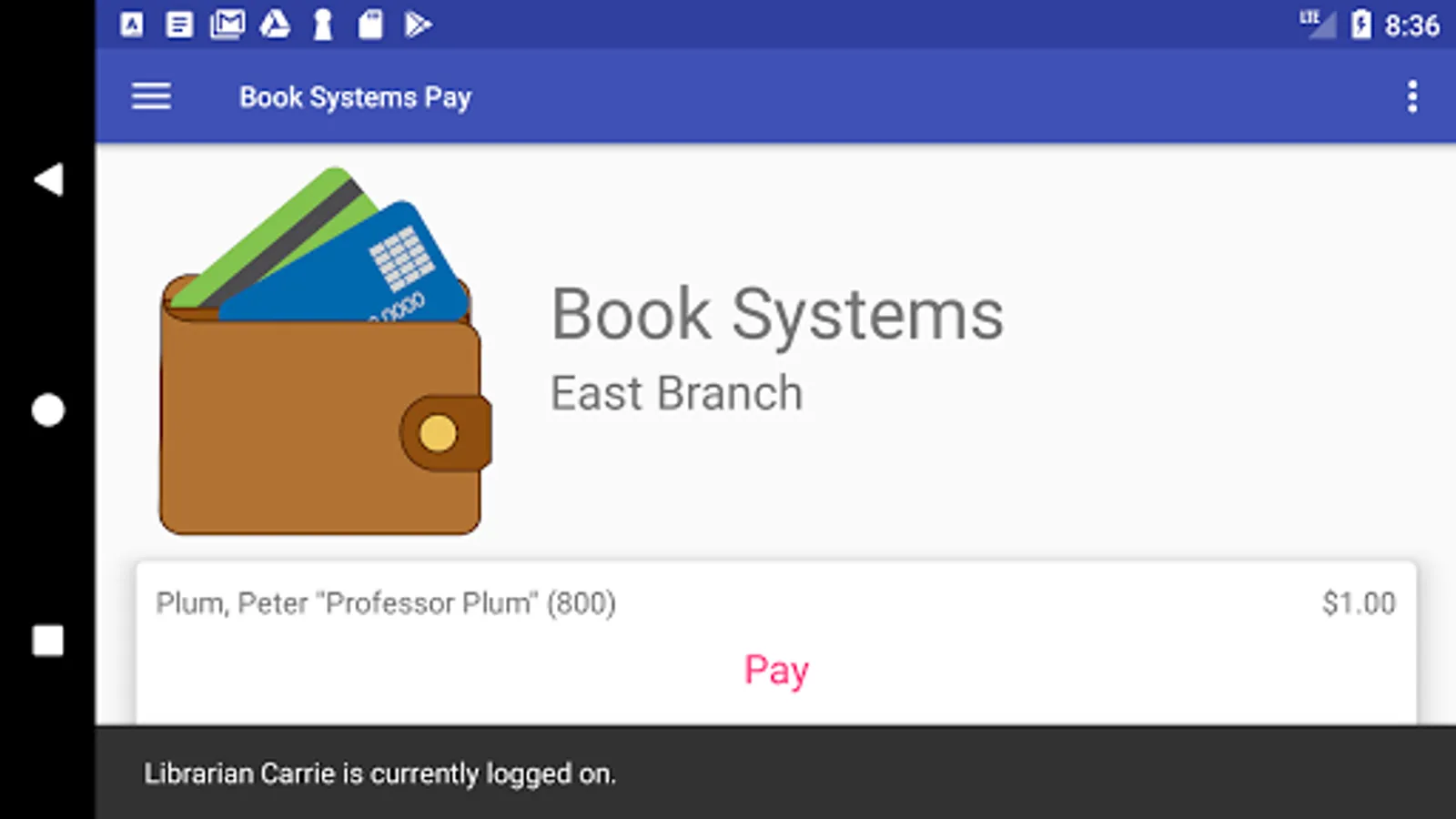 Book Systems Pay allows you to process electronic payments for your patrons. Accepting credit payments is just another convenience your library can offer your patrons; it can also alleviate issues with making change from your cash drawer. The app is integrated with your Atriuum database for real-time account updates when fines/fees are processed. Book Systems Pay works with PayPal and Square card readers.