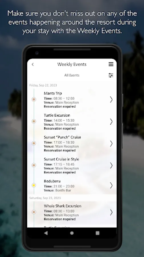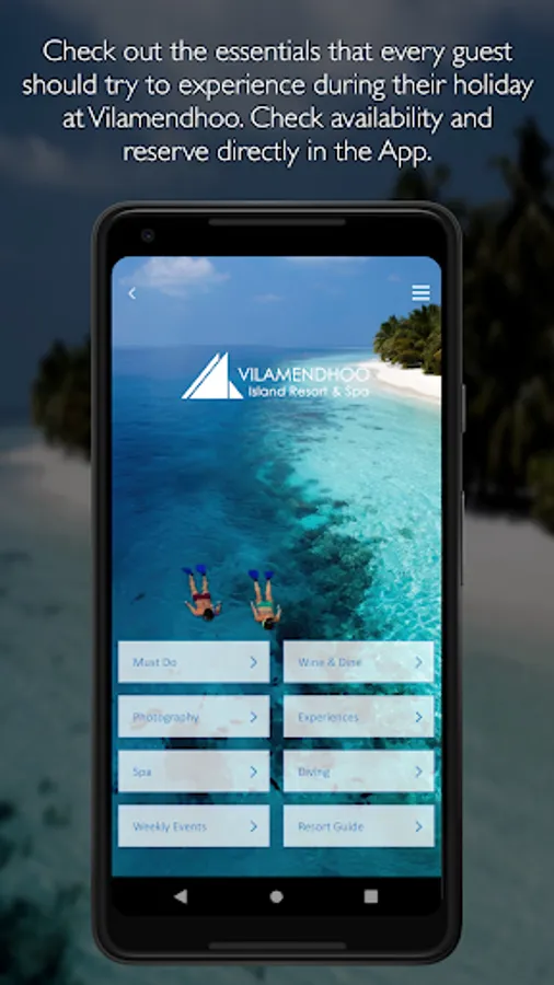 Explore Vilamendhoo Island Resort & Spa and its stunning facilities, plan your visit and activities from your device before and during your visit. Use this app to start planning your stay, and ensure you don’t miss-out on any of the incredible experiences on offer at Vilamendhoo Island Resort & Spa. During your stay the app provides the perfect travel companion, showing what’s on, providing you with fantastic inspiration from the recommended Must do list of experiences which you can book directly from the app. Your itinerary is always accessible to see what adventures you have planned.