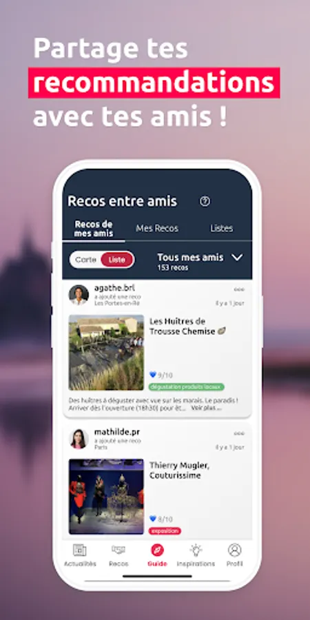 Guide, inspirations, recommendations between friends, quiz...