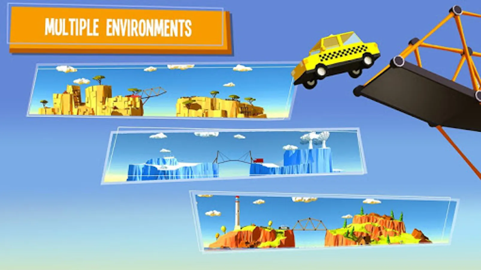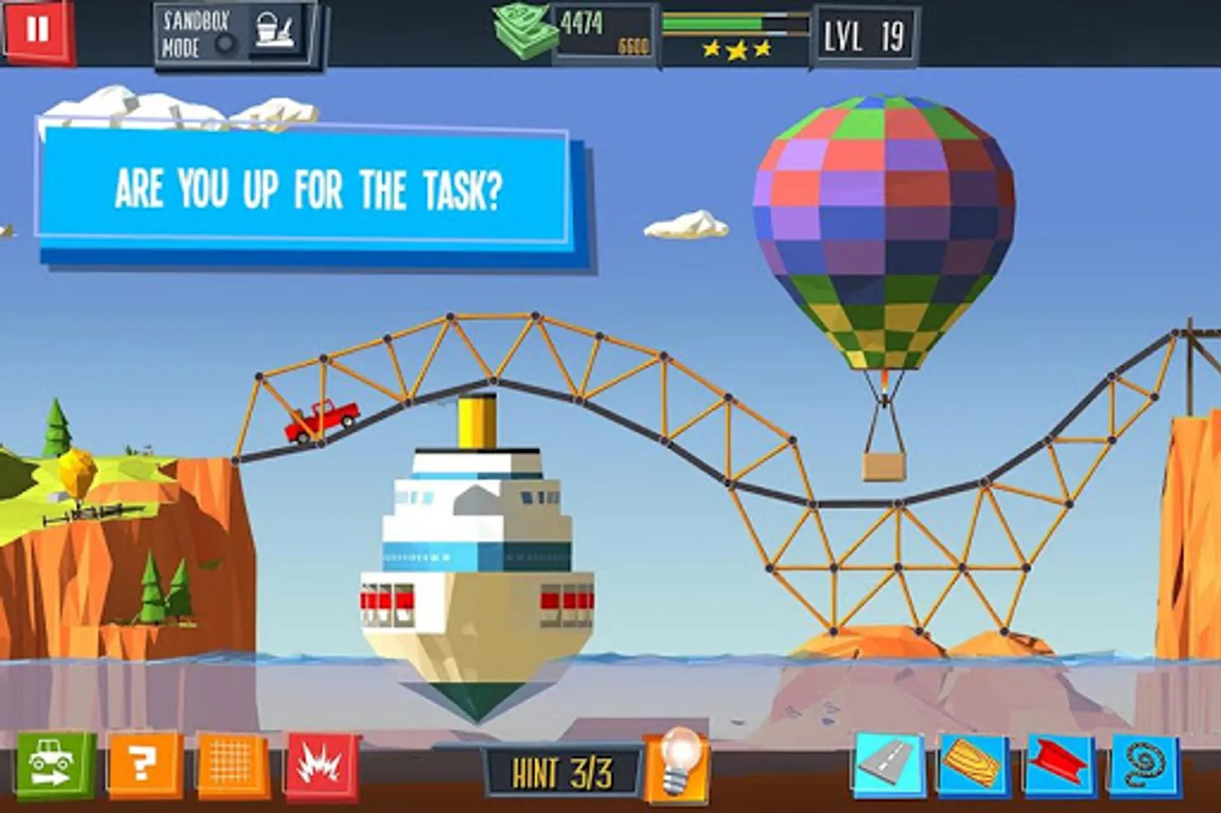 Test your engineering and improvisation skills in a puzzle game where the stakes are as high as they get. It is you who will construct bridges for cars, trucks, busses... And sometimes even monster trucks. Gather your wits and get on with the construction!