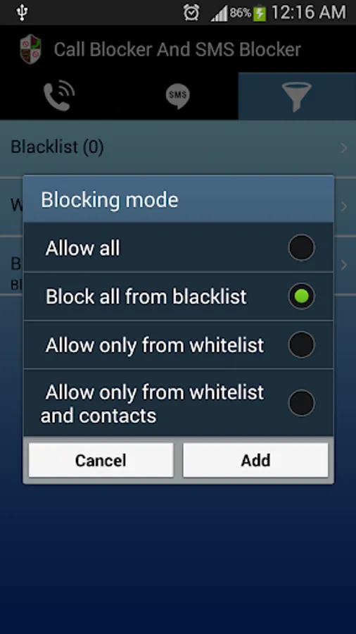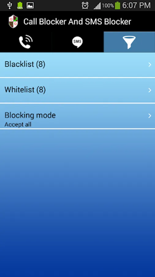 Using the options of this tab, you can block calls from private, unknown or all numbers. Also, you can turn on/off blocking with one simple tap.