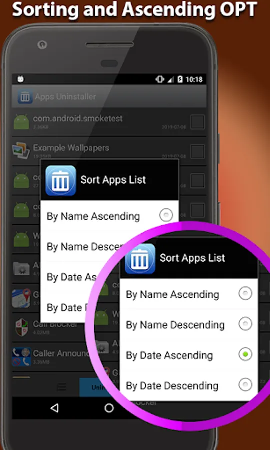 Uninstaller - uninstall apps sort. Click "Menu"->"Sort" to sort the apps in many sort types.