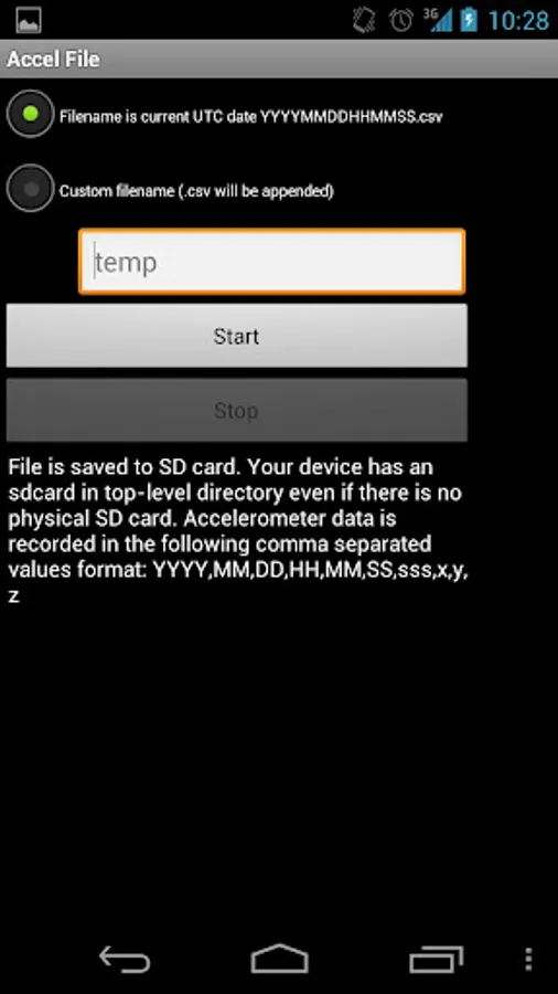 Create a file of the accelerometer output, with timestamp, that saves to your sdcard directory. Units are m/s2. Note: even if you don't have an SD card available on your device, you still have some sort of External Storage directory. Use a file manager app to find it.
