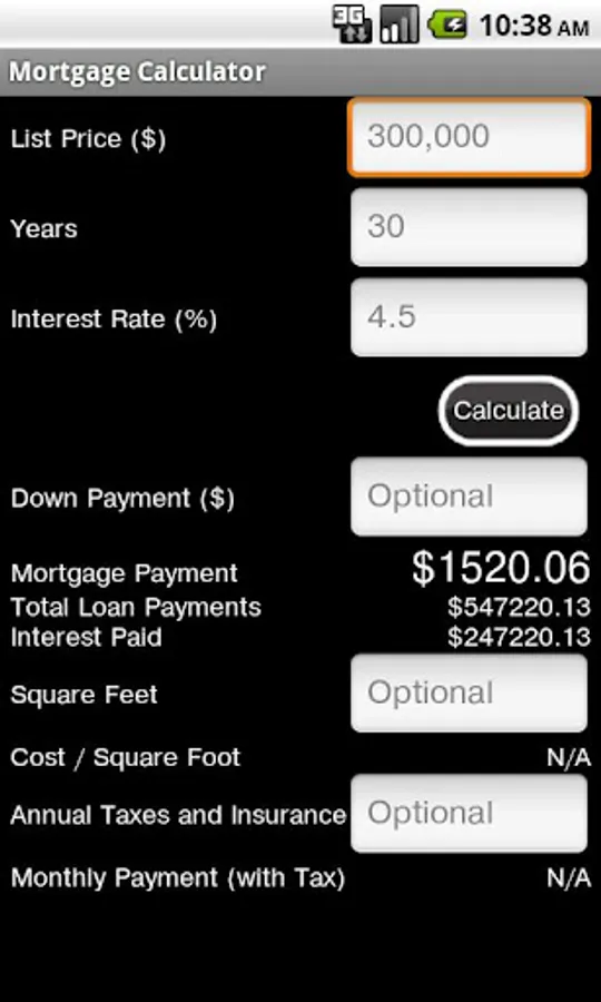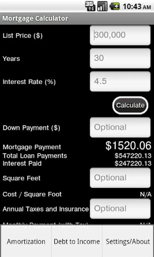 Simple mortgage calculator with optional cost per square foot and property tax calculations. Calculate total interest and total payments over the life of the mortgage loan. Figure out Principal paid off during life of the loan with amortization graph and whether you qualify for a loan. Now including menu tabs for amortization and debt to income ratio.