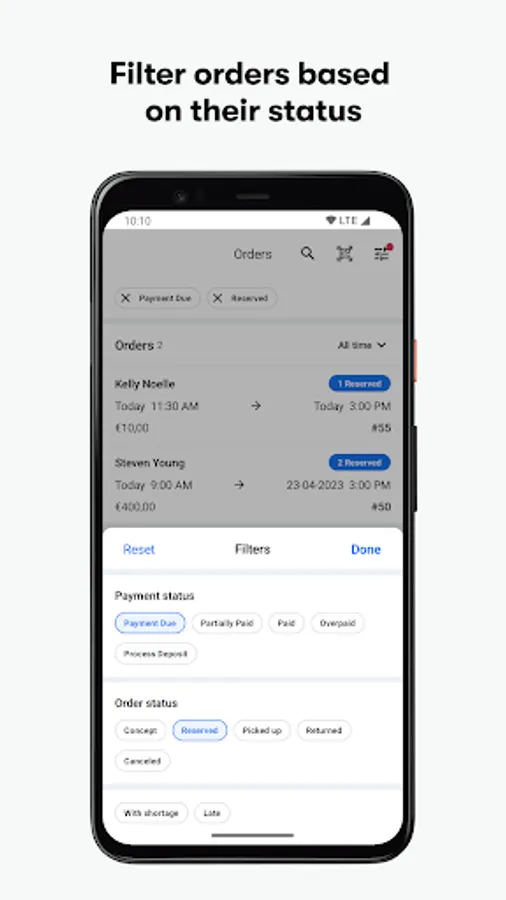 Booqable’s dashboard lets you quickly get an overview of your orders and filter them by date period, upcoming, and even late. Instant actions will enable you to rapidly register payments, pick up orders, and return orders from your dashboard.