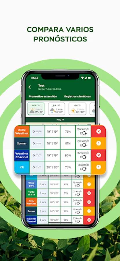 * Satellite Weather Station: Remote access to in-field current weather conditions (rain, temperature, wind gusts, humidity, dew point, atmospheric pressure), without needing to install any equipment, hardware or sensor.