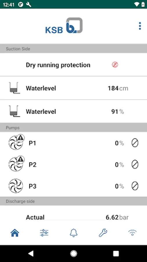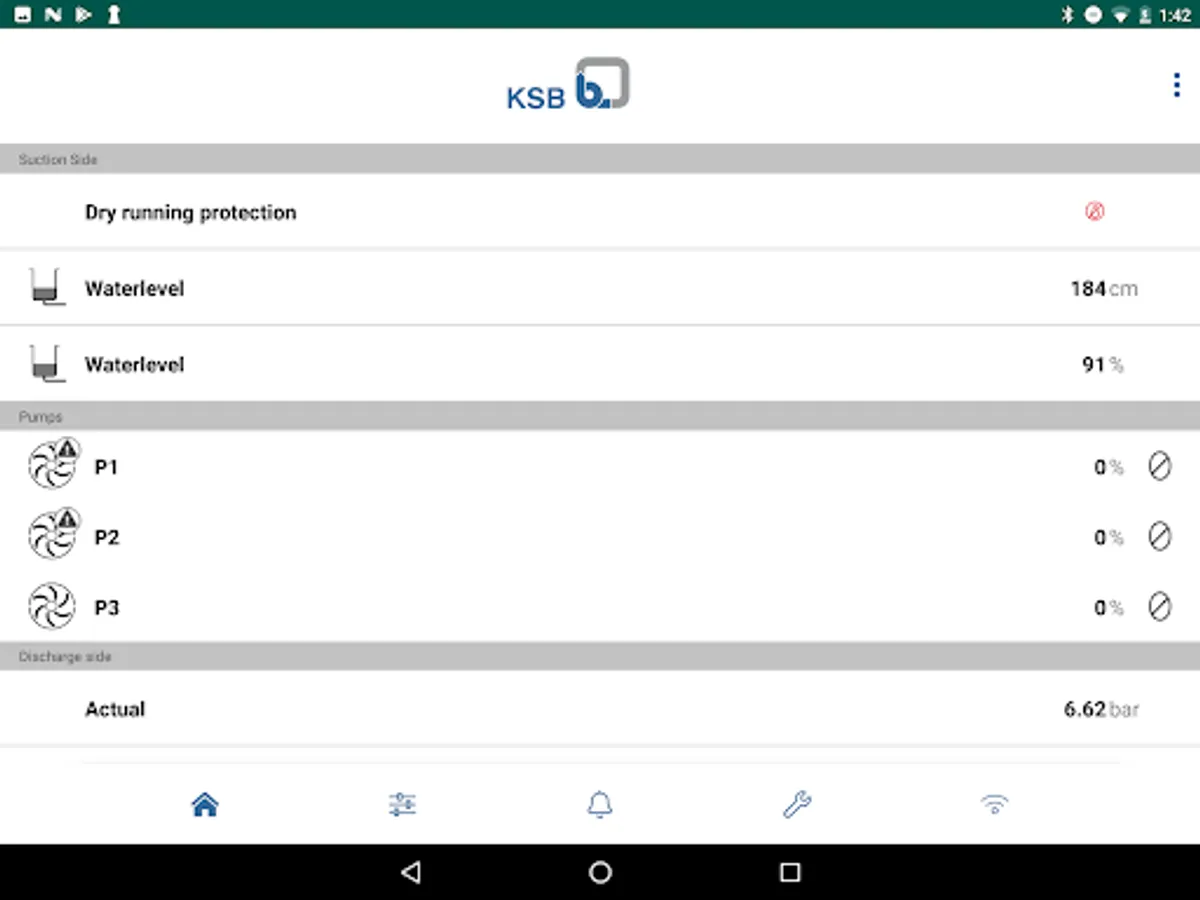 As soon as you are connected to the KSB Delta FlowManager app via the Bluetooth connection, you will be given an insight into the current status of the pumps, the pressures on the suction and pressure side and the programmed parameters.