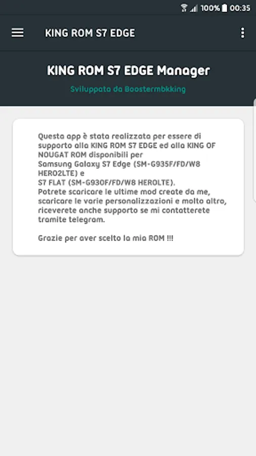 This app is designed to support the KING ROM S7 EDGE available for Samsung Galaxy S7 Edge (SM-G935 F/FD HERO2LTE) and S7 FLAT (SM-G930 F/FD HEROLTE).