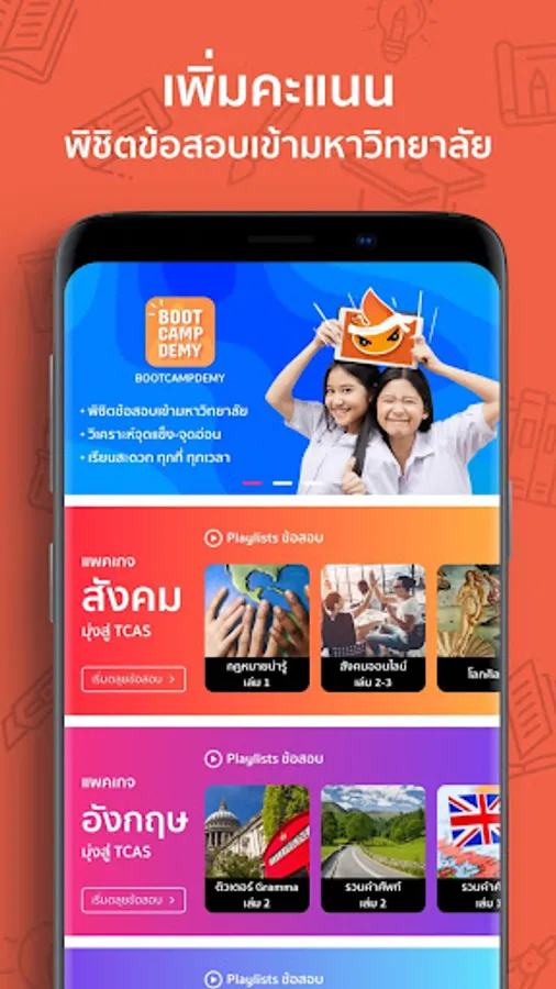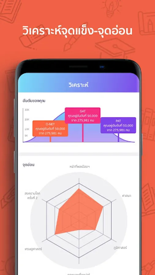 No need to carry all the books! The material is already inside the app. We also have the previous sets of exams like O-NET which upon your completion, your strengths and weaknesses will be revealed. This will significantly shorten your study time by focusing only on particular areas where you may not be very good at. Next, you can immediately link to relevant topics for reviewing the material and getting better by doing a practice set. You can study conveniently anywhere anytime.