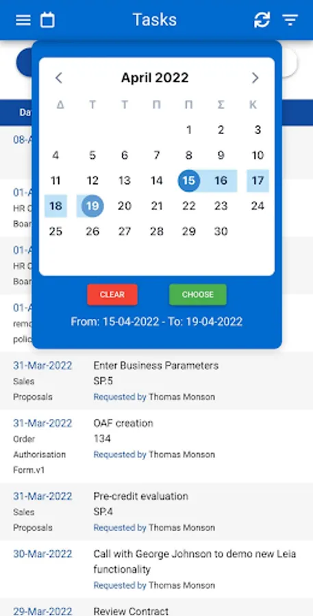 Stay up-to-date and check your upcoming meetings and tasks anytime from your mobile device. Search tasks that have been assigned to you or to a group you belong to in a specific date range, apply status and other filters. Complete a pending task easily by swiping to the right. Tasks with custom mobile forms that were created with Comidor Low-code platform are visible, too.