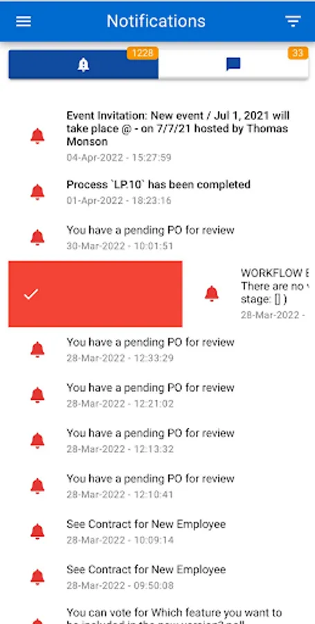 Keep track of the work on the go with smart alerts, system notifications and notifications sent by colleagues. Click on a notification to view the respective record, or hit dismiss. Filter notifications based on the state of your tasks and processes.
