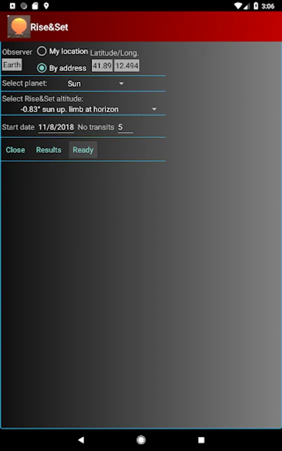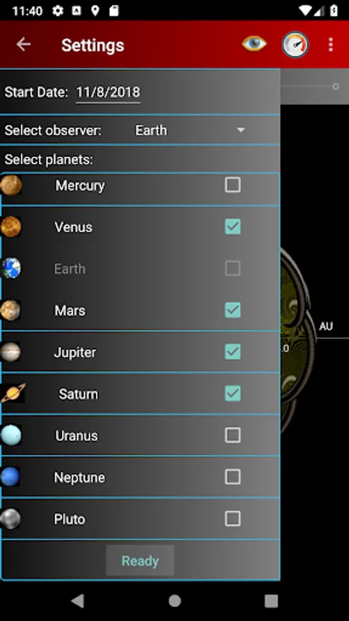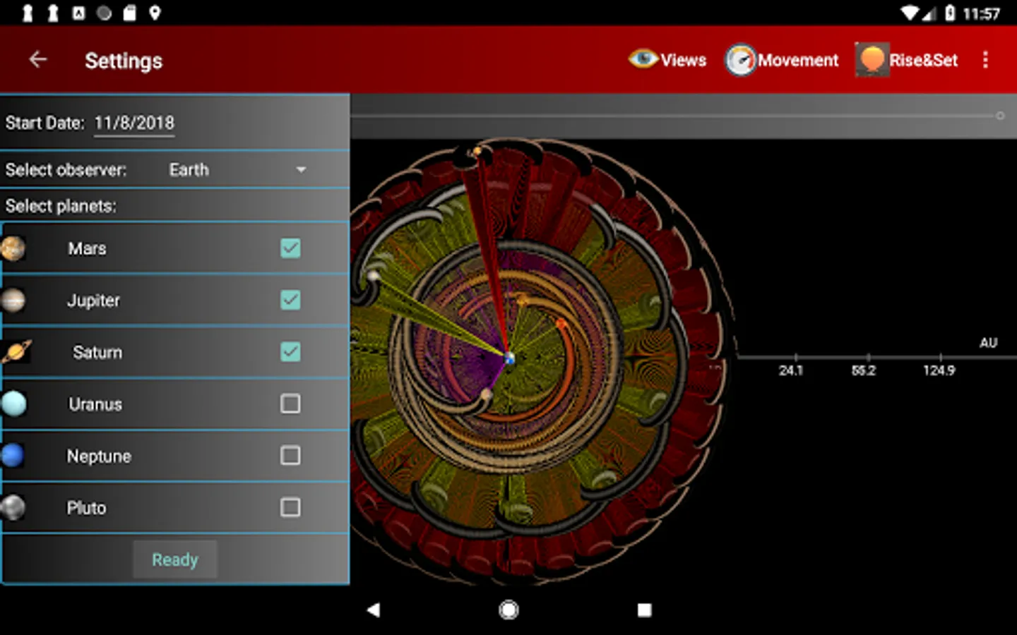 BoPlanets-Plus is a virtual planetarium, which shows the positions of the planets in the solar system relative to an observing planet, which can be selected out of the planets and the sun. The planets can be shown in various views. In the ecliptic view the Cartesian coordinates, in the equatorial view right ascension and declination, in the horizon view azimuth and altitude of the planets relative to an observing planet are displayed. In the horizon view the position of the observer on the observing planet can be the current location of the phone (the location of the phone on the planet is the same as on earth) or can be determined by an address (analogical to the earth as observing planet).