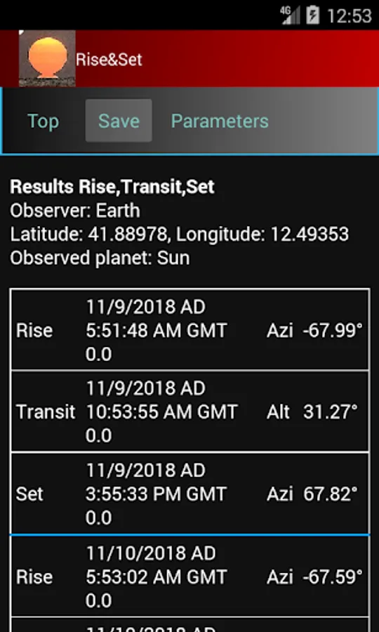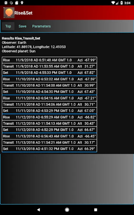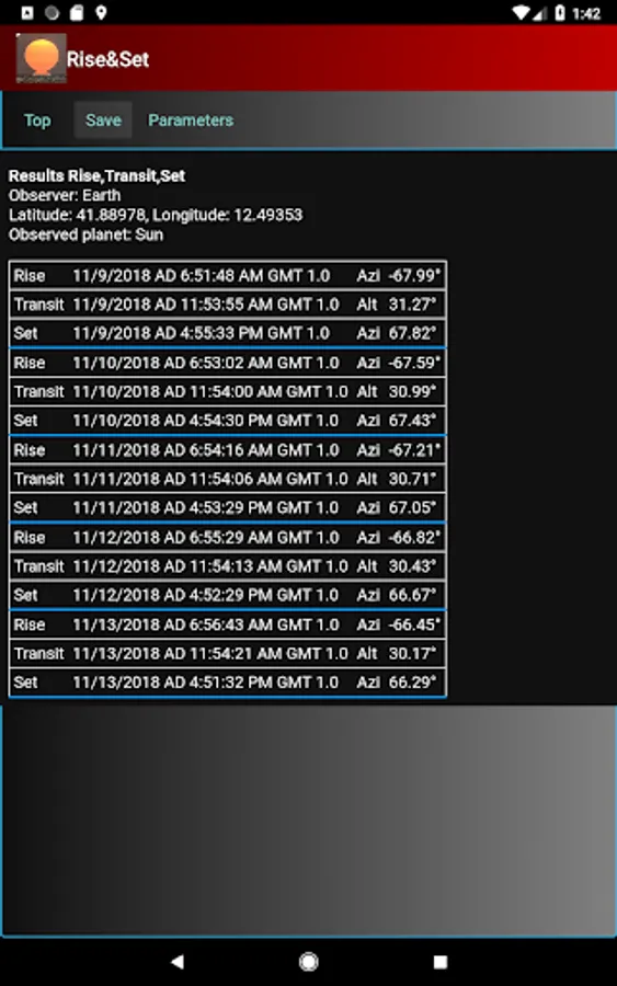 A list of rise, transit and set times of a planet, as seen by an observer on the observing planet, may be generated.
