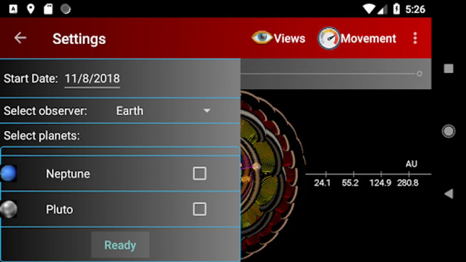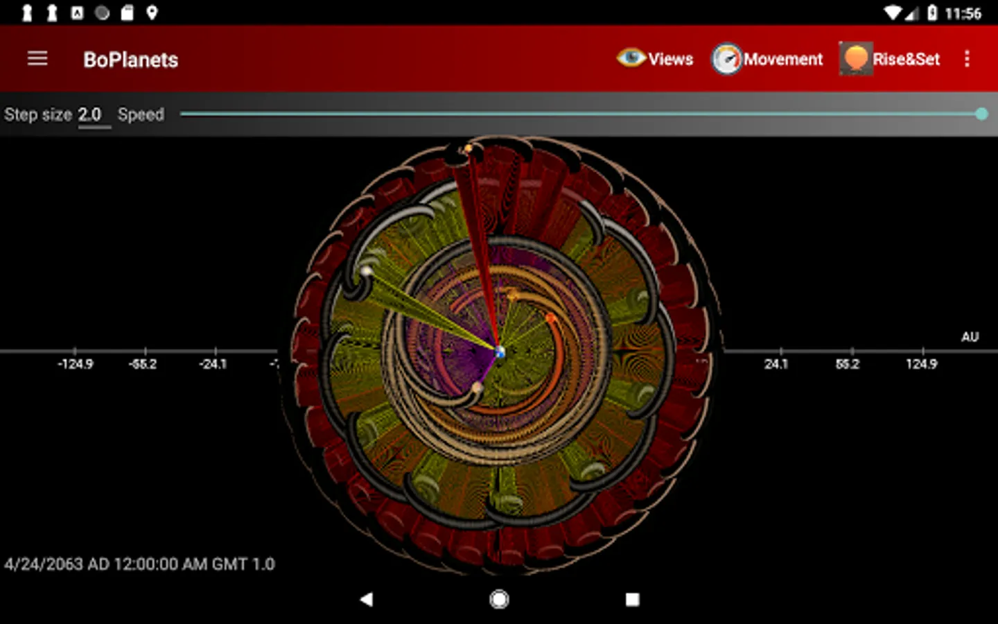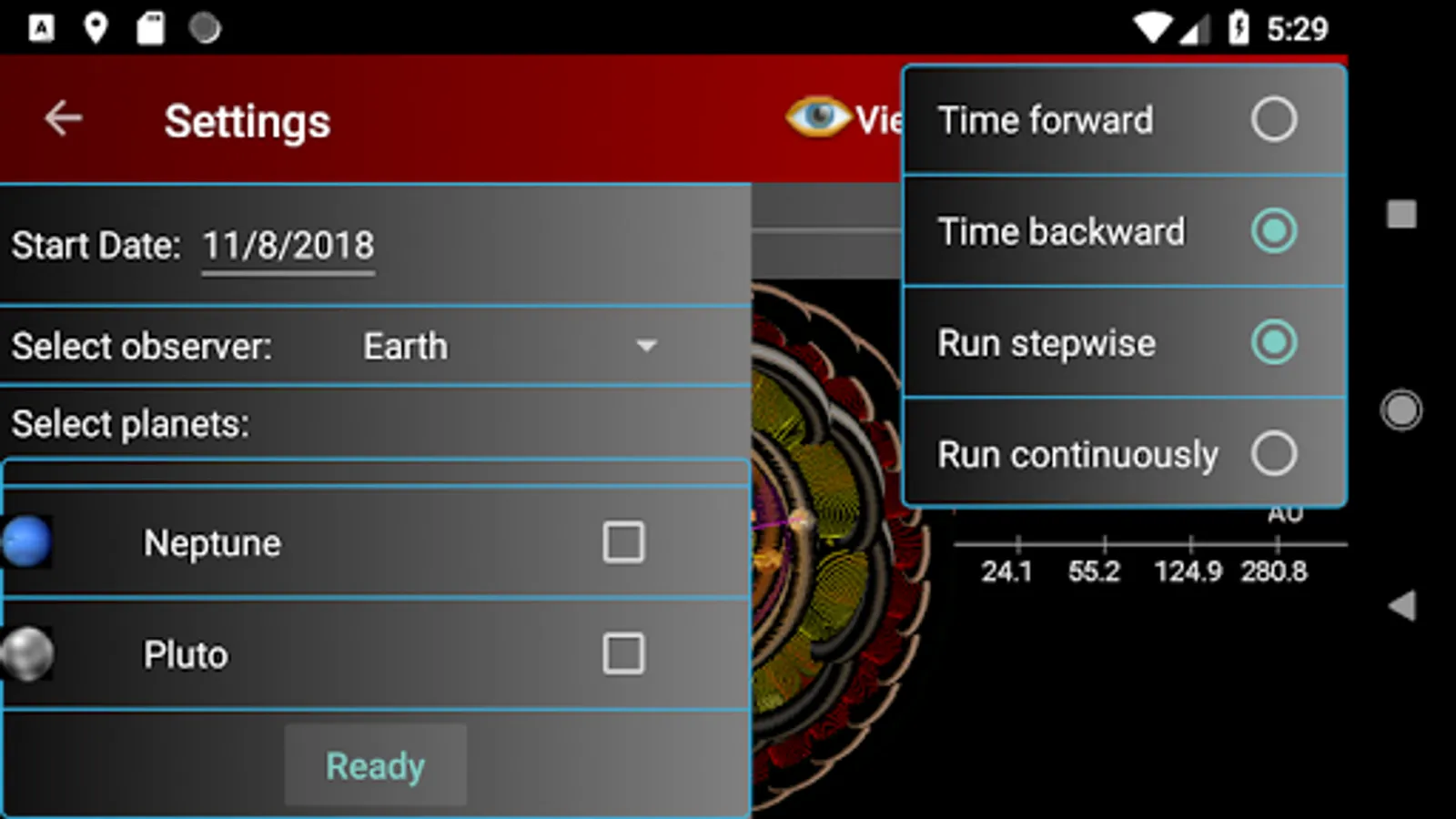You can let the planets move by single steps or let them run continuously. The speed may be varied by a speed slider.