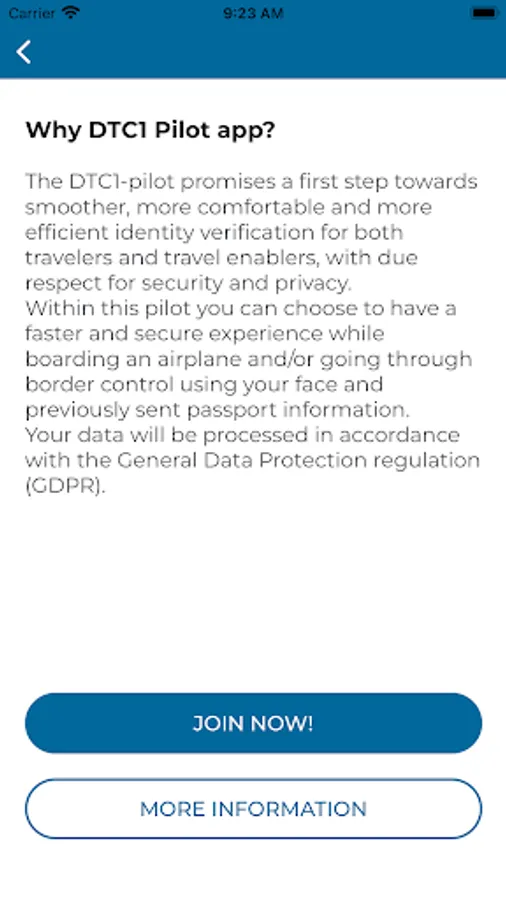 The DTC1 app is the official app for participation in the DTC1 pilot, which is a pilot organised by the Central Government and KLM and developed by Idemia.