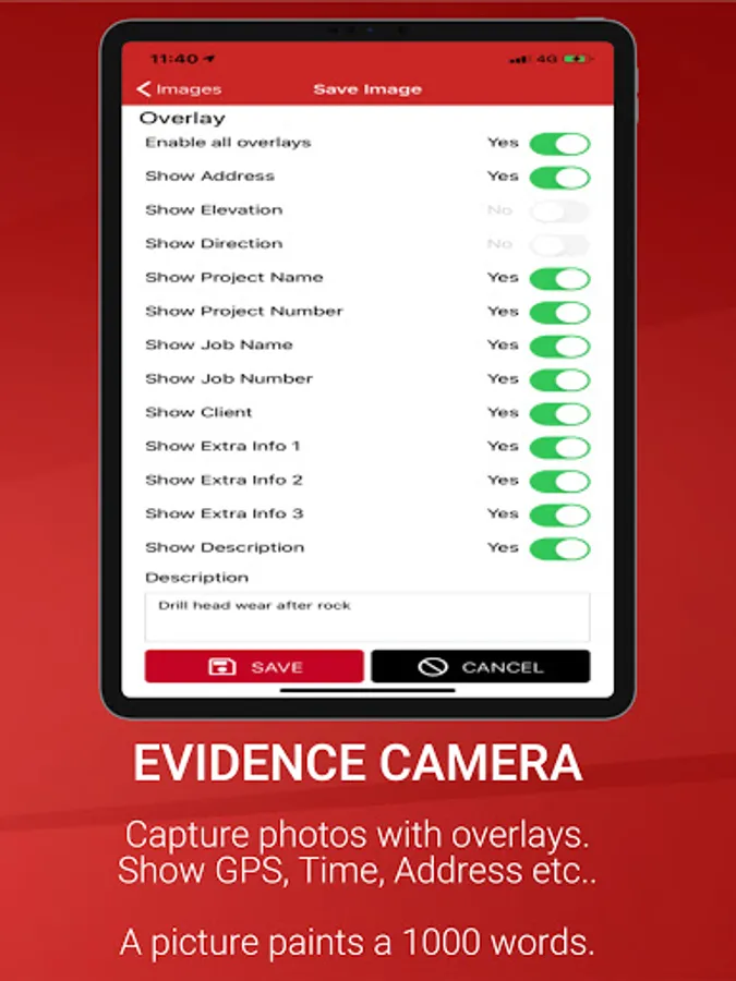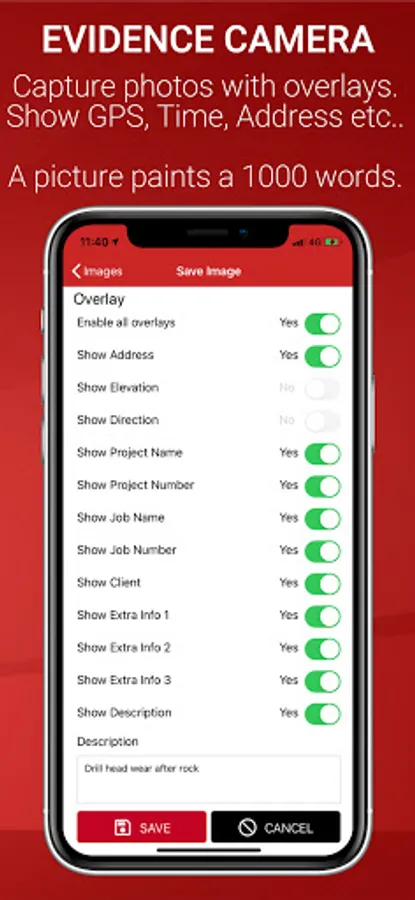 - Capture site photos with custom overlays. Show GPS location, timestamp, address, project details, customer details, and more.