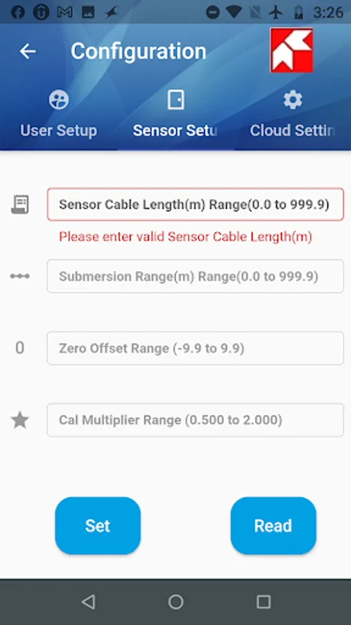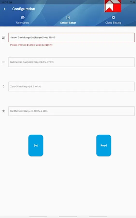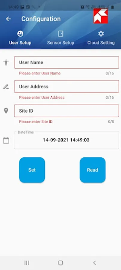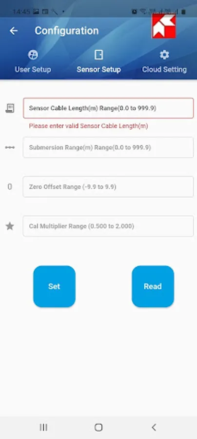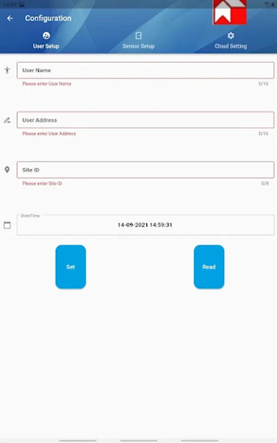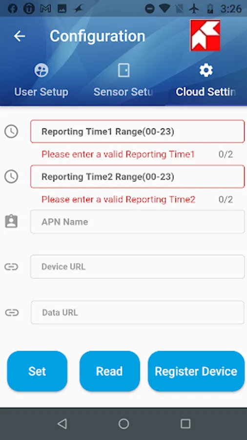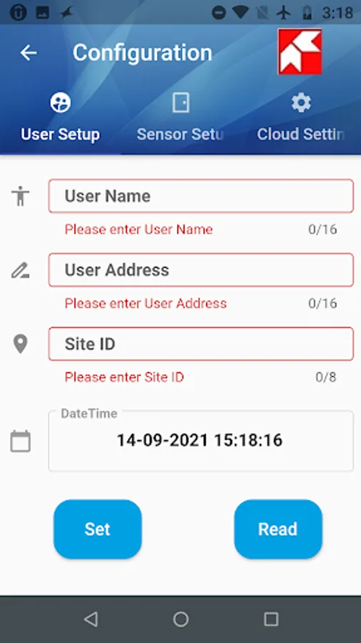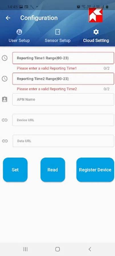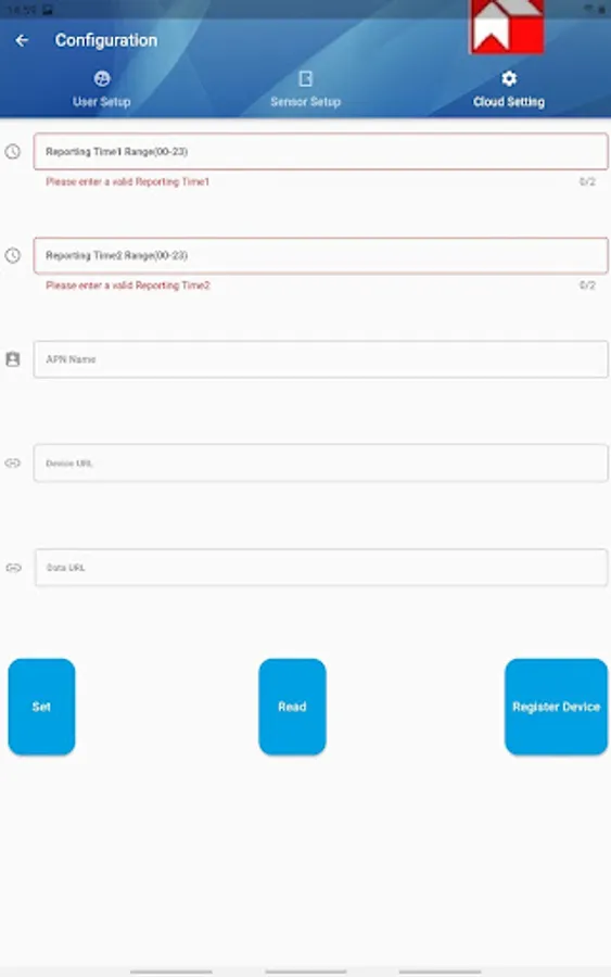 • There are 3 configurable menus in the App those are User Setup, Sensor setup and Cloud Setting.