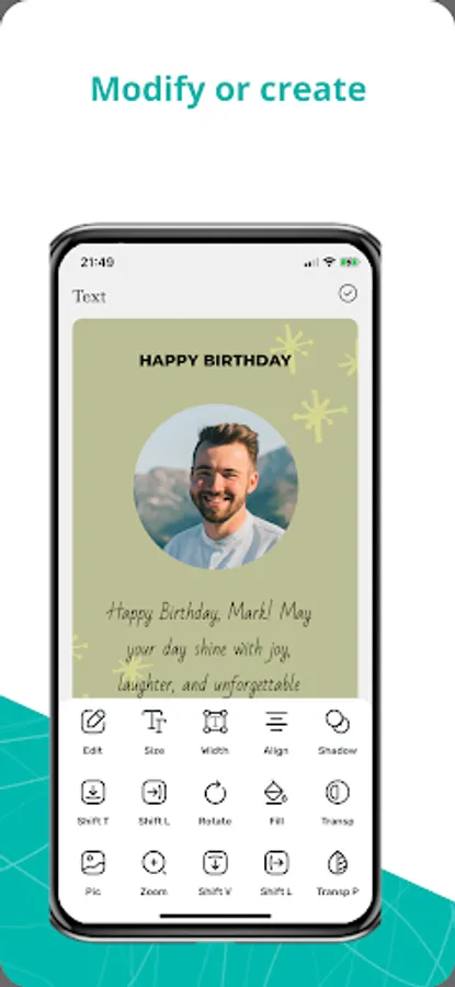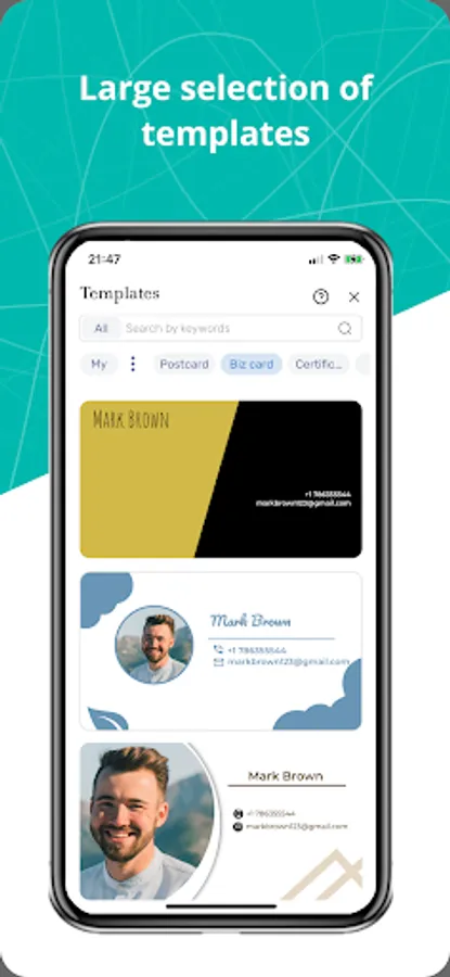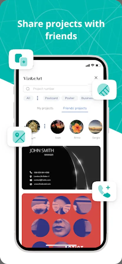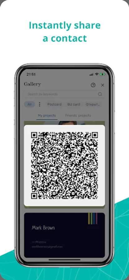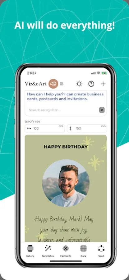 The new AI version will do everything for you if you want it to! It will create business cards, greeting cards, or invitations for anyone you tell it to. The app understands your natural speech or your text. You can modify, add, or create any element in the template. The app allows you to create any element that may be needed in your project, starting from a text with a photo inside it and ending with a QR code and video. You can also create your own personal templates and even share your projects and templates with friends in this app and view their projects too. Send your project to anyone and however you want, or print it. In this app, you can also easily share contacts from business cards through a QR code right in the app.