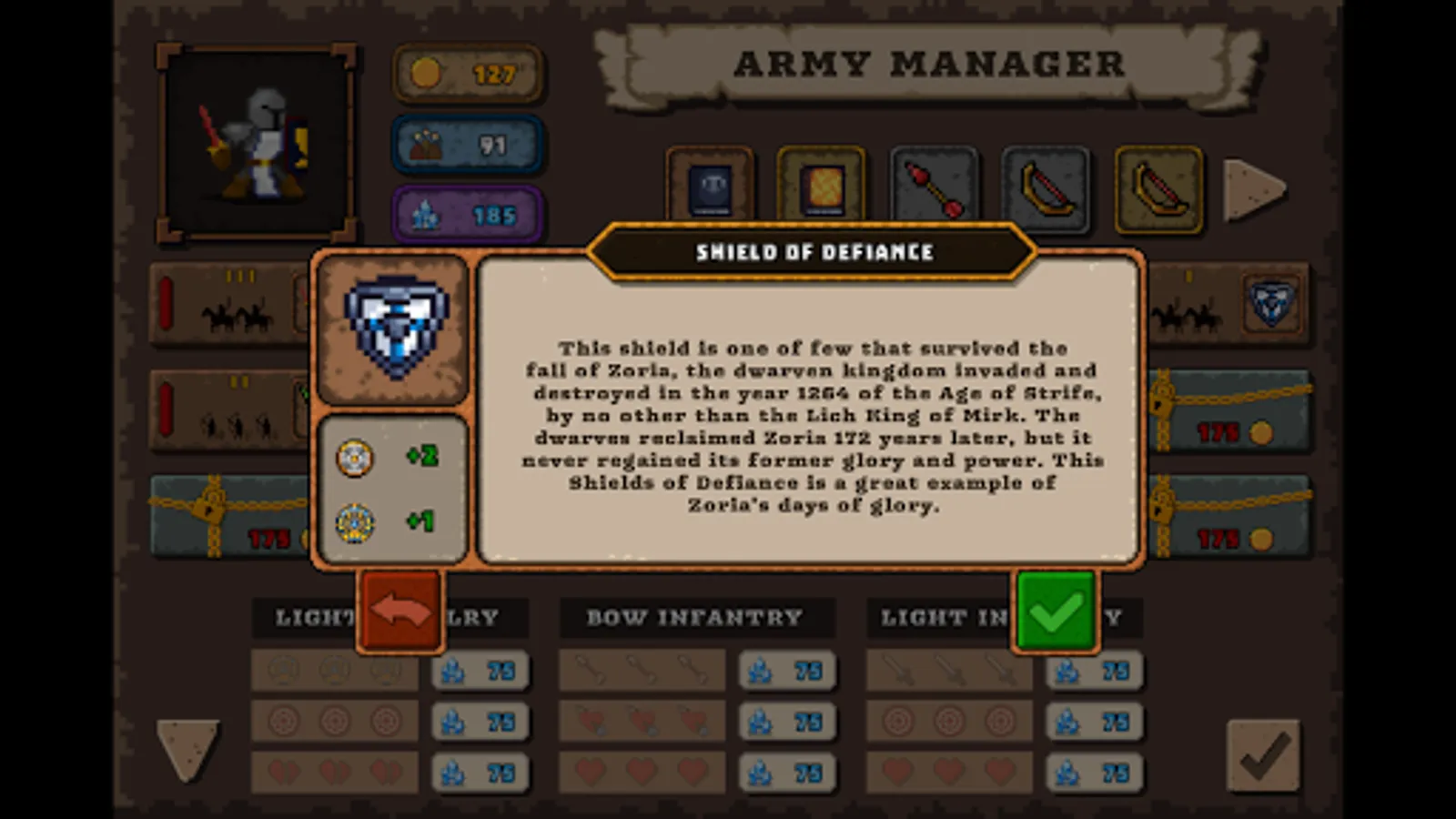The basic tactical battles mechanics are very straightforward, but as the enemies become stronger and more numerous you will have to employ some more advanced strategy (as well as hire more troops for your army). Try to hold your units in formations as long as you can because the enemies will try to destroy your second line units if they'll have the chance. Ranged units and spellcasters are especially prone to enemy cavalry and infantry.
