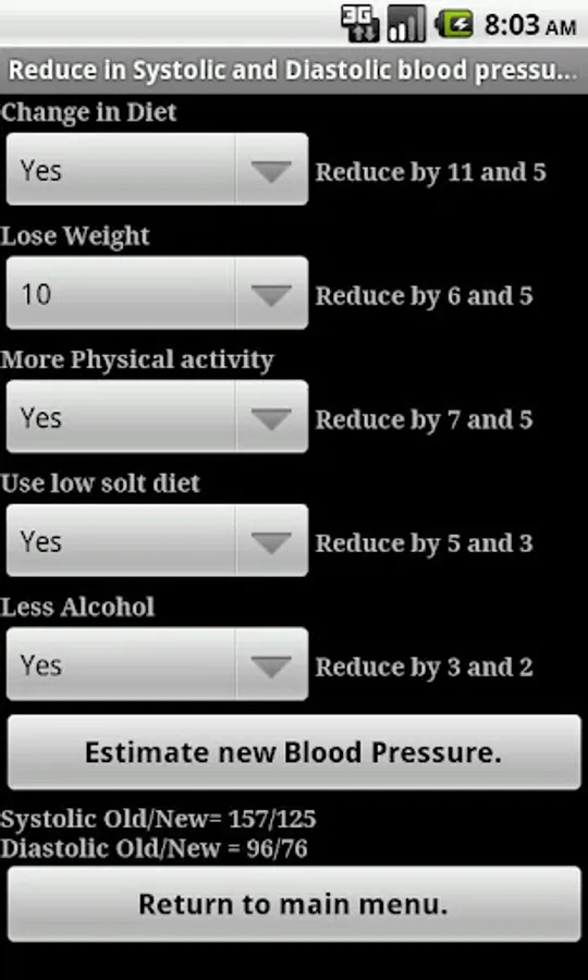 Application calculates how changes in lifestyle: Change in diet, Lose weight, Physical activity, Low salt diet, Less alcohol may reduce your blood pressure.