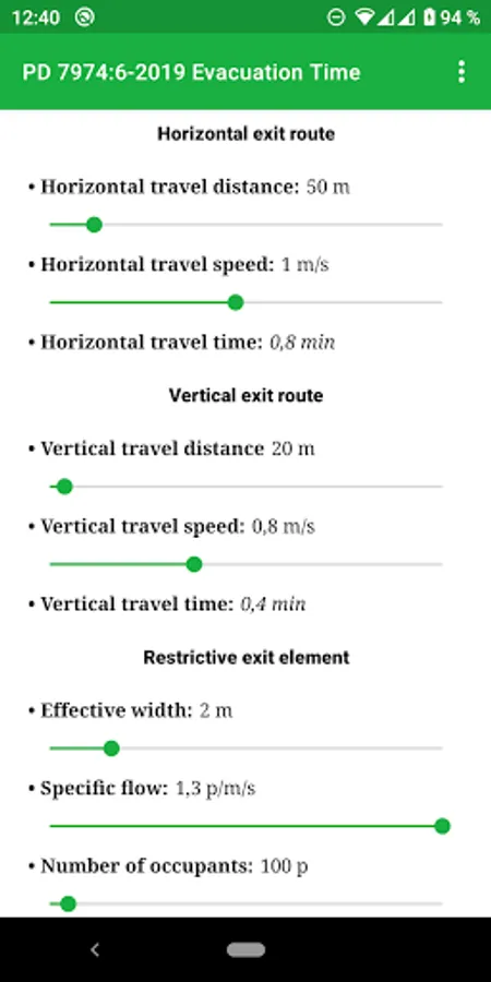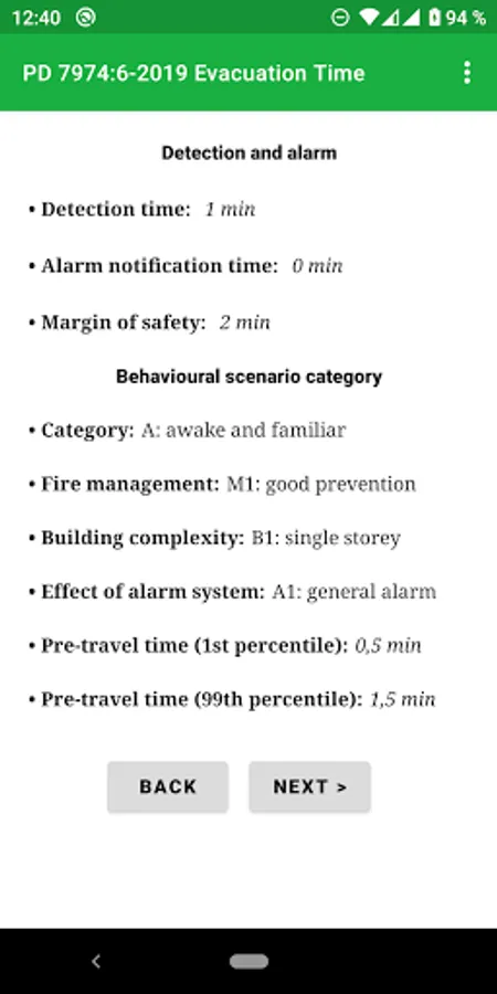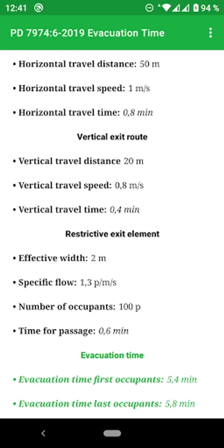 Prediction of evacuee movement is an essential component in most performance-based designs. Safe egress is assumed to be achieved if the required safe egress time (RSET) is sufficiently shorter than the available safe egress time (ASET). The app is aimed at determining the RSET by applying the PD 7974:6-2019 standard principles. The RSET calculation considers a number of variable parts to arrive at an overall estimation of escape time: detection time, alarm time, pre-movement time, evacuation time to a place of relatively safety, and a margin of safety.