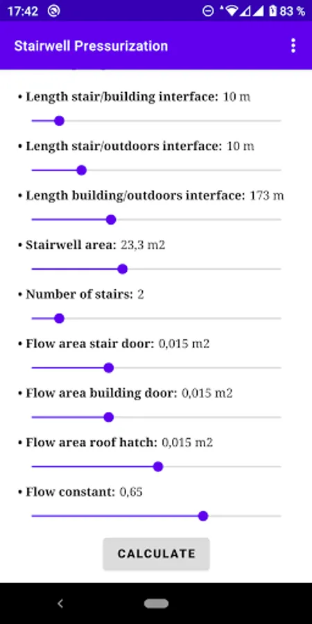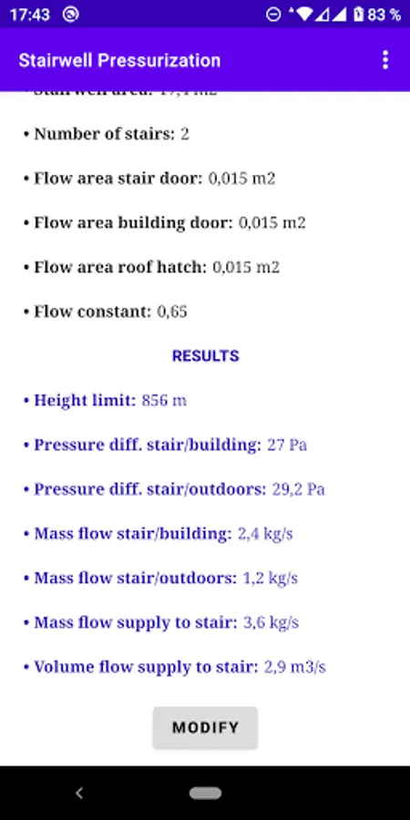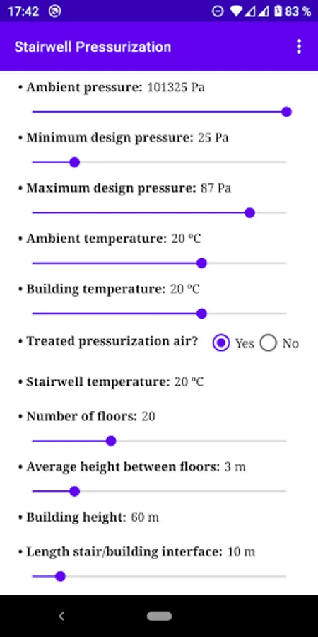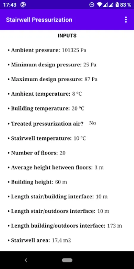 The app solves a large set of well-known algebraic equations developed by Klote in the Handbook of Smoke Control Engineering. The method applied is appropriate for sizing pressurization fans in stairwells and to gain conservative infromation about the feasibility of achieving acceptable pressurization.